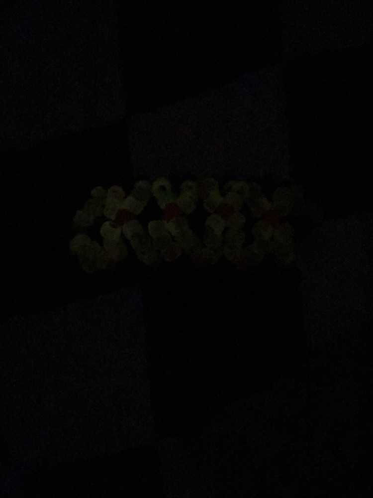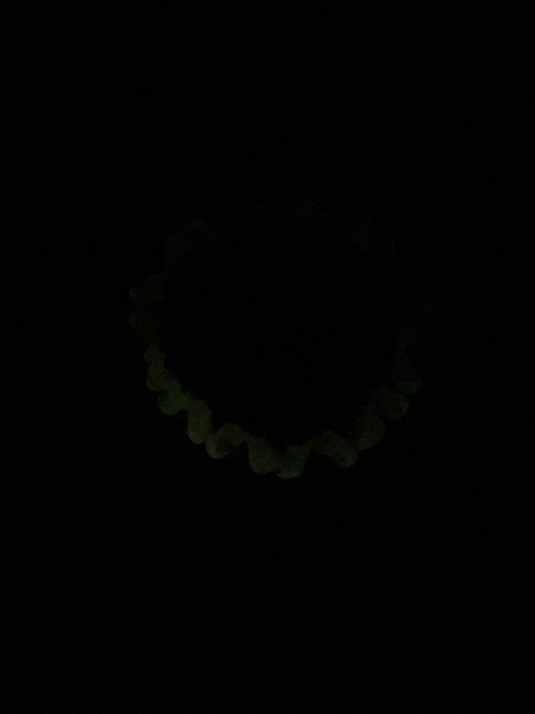 Orange and black partail glow in the dark UFO cuff. made with pony beads, and rainbow elastic string. Put up to the light and turn off the light to see it glow. 100% hand made by me. if you buy thanks for really helping me out!