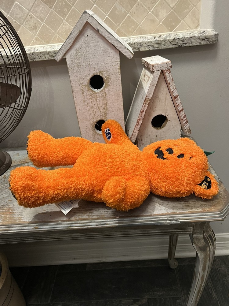 The Build-a-Bear Pumpkin Glow Halloween Teddy Bear is a 16-inch plush bear in orange color, featuring a Jack O Lantern character design perfect for Halloween. This original Build-A-Bear Workshop creation is made of plush material and includes a light-up feature that works. It is a single unit sold, not an antique, suitable for the time period of 2010-2019, and part of the Build-a-Bear franchise. This festive bear is a fun addition to any Halloween-themed collection or as a playful decoration during the spooky season. Will ship without batteries.