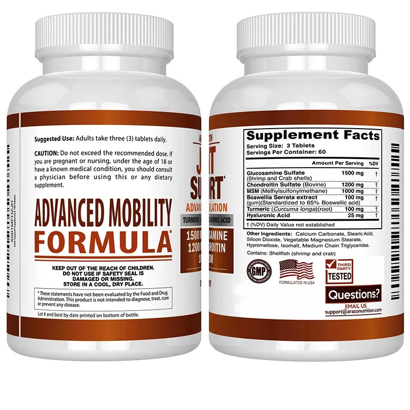 Arazo Nutrition - Joint Support Made in USA Powerful joint relief; a complete dietary supplement for joints; it helps repair cartilage, boost joint mobility, increase joint flexibility, support joint structure and protect joint tissue; suitable for anyone with joint pain, joint inflammation or stiff joints; for men, women and seniors Extra strength ingredients; Glucosamine 1500mg, Chondroitin 1200mg, Msm 1000mg with Turmeric, Boswellia, Hyaluronic Acid for better joint health, range of motion and comfort; helps rebuild and maintain joint flexibility and ease discomforts that comes with age, weight, or sports related stress Lubricates joints; our hip and joint formula contains Hyaluronic Acid as a lubricator and shock absorber for joints Made in a GMP certified facility in America and third party safety tested for purity Common names; there are many different ways people try and spell or pronounce Glucosamine and Chondroitin; here are some common mis-spellings: glicosamina glucosamina glucosimine chondriton condroitan guclosamine glocosamin gucosamine glucoamine cosamine glucousimine glocosamina glucosamin gloucosamin glucosomine chondroitina condroitin condroitina chrondroitin condrotin chodroitin chondrotine chondroition condroiten chondoitin chondroitan condroiton chondritin chondroiton