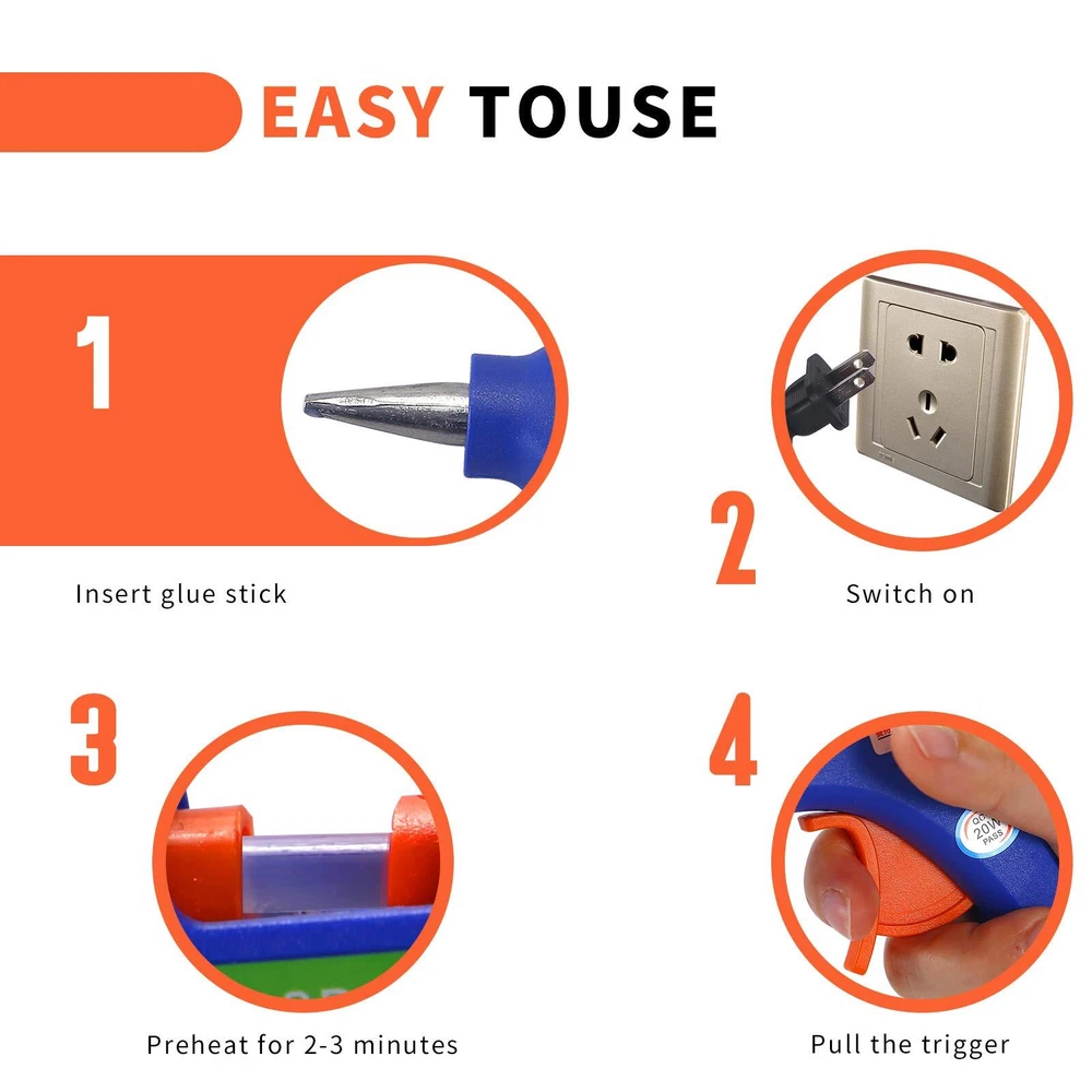 The hot melt glue gun can be used to bond a great diversity of materials such as wood, metal, plastic, glass, ceramic, rubber, leather,stone, wicker, lace, textile, fabric and paper, also for daily quick repairs at home school or office. Easy to operate 1. Insert the hot glue stick from the back of the glue gun. 2. Plug in to preheat for 3-5 minutes. 3. Pulling trigger to use (If the glue stick can't be used up in one time, leave the remaining glue stick in the gun). Warm Tips: 1.Don't use in humid or high temperature and keep it away from children. 2.The nozzle and the glue liquid are hot when the gun is working, please don't touch it. 3.Don't disassemble the melt glue gun in any case. 4.Keep a drip card or tray under it when you set it down and you won't need to worry about any mess. 5. Glue gun nozzle must not be held upwards. Specifications: - Hot Glue Gun ● Material: plastic and aluminum ● Power: 20W ● Voltage: 100 to 230Vv ● Nozzle diameter: 0.070-0.078 inch ● Cable length:49.5inch ● Size: 5.1 * 4.3inch ● Pre-heat time: 3-5 minutes -Wood Craft Sticks ● Material:Wooden ● Color: Light yellow ● Size: 14 *1.0 cm 2 mm thick ● Quantity: 20PCS - Glue StIcks ● Material: Resin EVA ● Grade: A+ ● Softening Point: 73°C±5 ● Working Temperature: 120°C - 150°C ● Cure time: 8 - 12s ● Diameter: 7.0mm ● Color: Transparent White - Carrying Case Material: Hard Shell EVA Size: 7.5 x 6.5inch Color: Black Packing List 1x Hot Glue Gun 20 x Glue Sticks (7.0mm x 150mm) 20 x ice pop sticks 1 x Carrying Case 【QUICK HEATING & CONSTANT TEMPERATURE】The hot glue gun heats up in 3-5 minutes and the built-in constant temperature module keeps your mini hot melt glue Gun at a constant temperature to prevent the glue sticks from dripping during using.Ideal for home, office and school use, DIY crafts projects with metal, wood, glass, card, fabric, plastic, ceramics and so on. 【EXTRA 20PCS GLUE STICKS & 20PCS WOOD CRAFT STICKS】Our glue gun kit provides 20 pieces environmental-friendly and strong-adhesive transparent glue sticks(7.0mm x 150mm) and 20pcs ice pop sticks(2.0mm x 140mm),Perfect for home, office and school DIY crafts like metal, wood, glass, card, fabric, plastic, ceramics etc.Great christmas gifts or birthdy gifts for kids 【SAFETY DESIGN & USER-FRIENDLY】The built-in fuse prevents it from overheating,Solid durable, shock-proof and heat-proof plastic outer body.The nozzle is wrapped in rubber that will protect it from scalds.It’s easy to toggle the On/Off switch so that you don't need to unplug them every time you want to turn them off, and the LED indicator light lets you know that the tool is heating up. Simply pull the trigger gently, the melted glue will gently exude. 【FLEXIBLE KICKSTAND & EASY CARRYING CASE】The detachable and flexible stand holder makes your hot glue gun stay stable and upright in the process of using, thus to prevent the melt back to damage the gun.The equipped tool carrying case is perfect for storing glue gun sets, Easy carrying and doesn't take up too much space.Our hard storage case also fit for gorilla mini hot glue gun Kit and hot glue sticks 【WARM PROMPT】:Keep clean of the glue sticks to avoid impurity block the nozzle, and do not pull out of the remanent glue sticks after use. Our hot glue gun is a great gift for home, office and school DIY crafts.If there are ever any issues, just contact us and we will make it right.