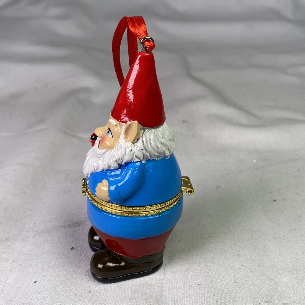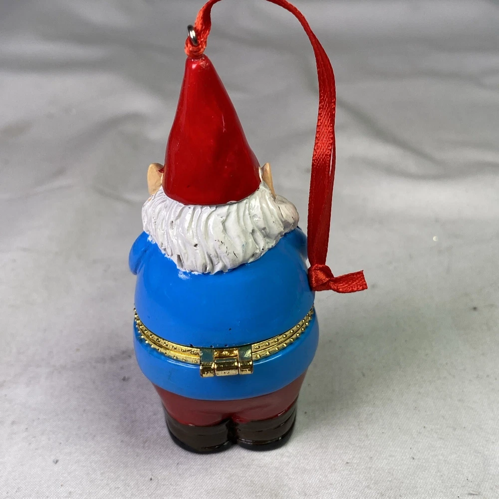 Theme:Christmas GnomeMeasurements:3"L x 2"W x 3 1/2"HShape:GnomeColor:MulticolorMaterial:Resin, BrassBrand:UnbrandedFeatures:Hanging, Holds A Small GiftMPN:43787Seller Notes:“Good condition as seen in photos.”Type:Trinket Holder OrnamentUPC:Does Not ApplySize:SmallOccasion:Christmasgtin13:Does Not Apply