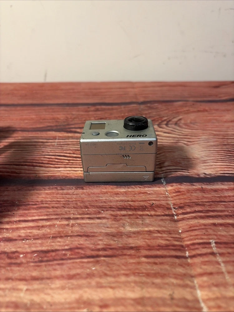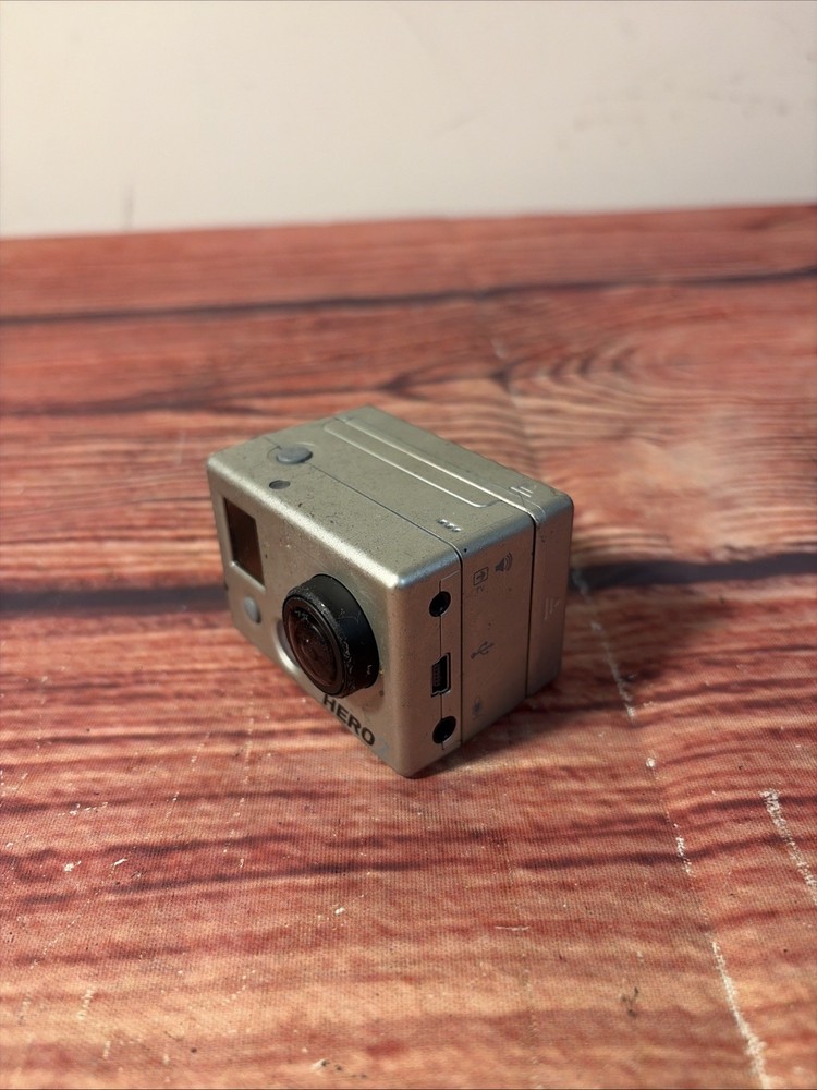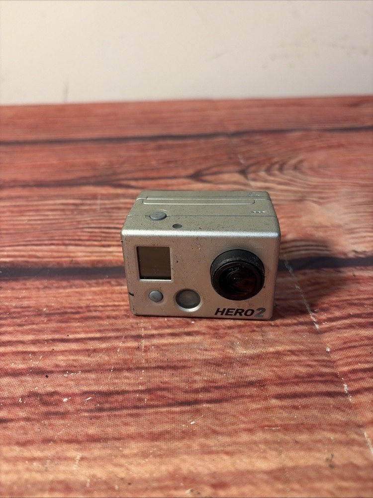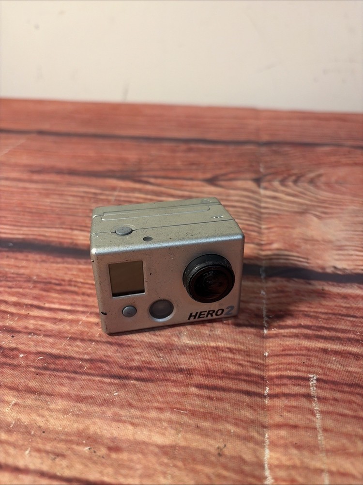 GoPro HERO2 action camera with original waterproof housing. Details: • Brand: GoPro • Model: HERO2 (HD2-14) • Includes original waterproof housing • Camera powers not tested (battery not included) • SD card not included Condition: Used condition with cosmetic wear from prior use. Lens housing shows surface scuffs. No cracks observed in housing. Sold exactly as shown in photos.