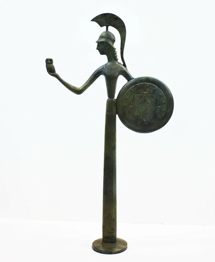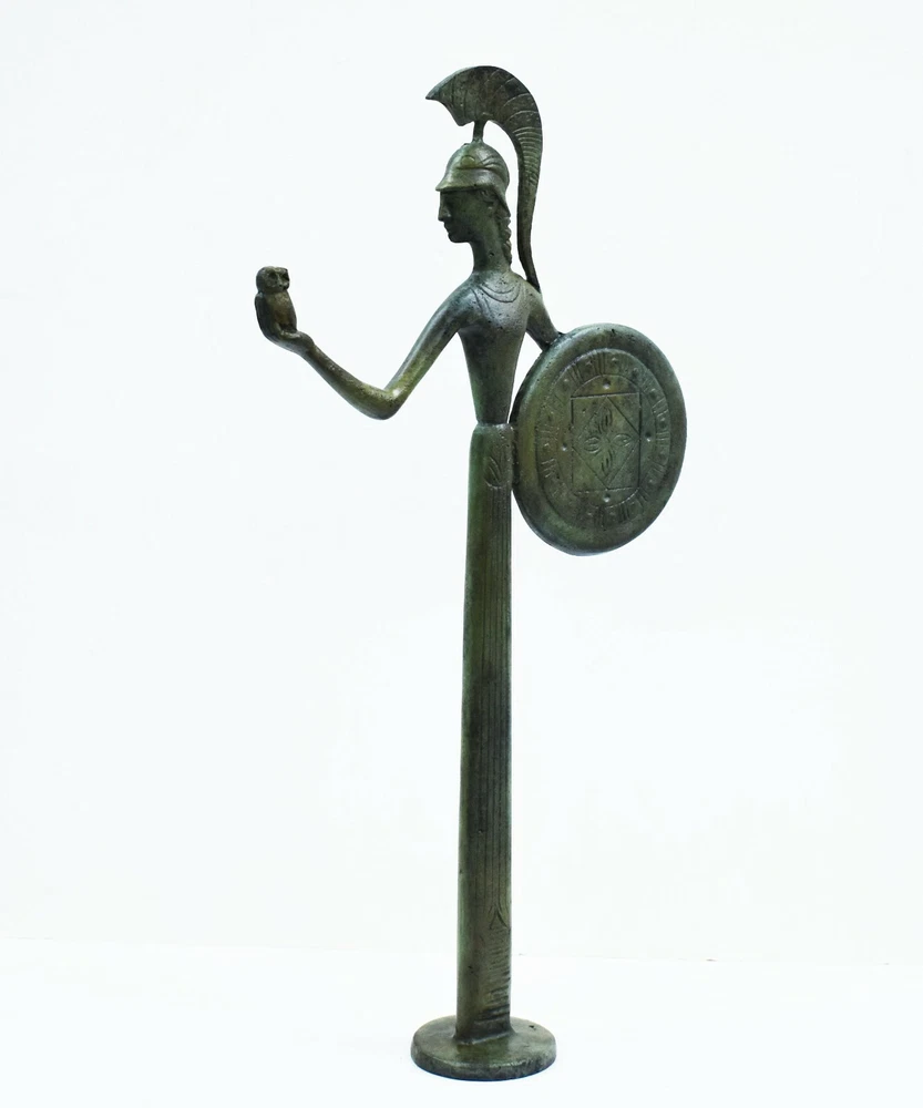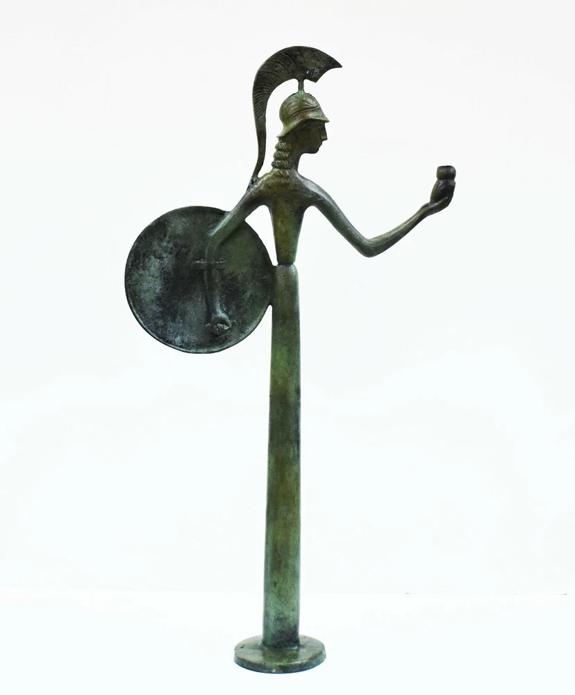 GODDESS ATHENA BRONZE STATUE Athena, daughter of Zeus, was the goddess of intelligence, wisdom, resourcefulness and strategic thought. She was also the protectress of women, female crafts, the poetic symbol of reason and purity. Athena the patron goddess of the city Athens was very important to the Greeks, since they named her the Iliad’s goddess of fight, the warrior-defender, the protector of civilized life. The owl was the symbol for Athena. According to myth, an owl sat on Athena's blind side, so that she could see the whole truth. All our bronze items, are cast in Greece, using the traditional 'lost wax' method. As nothing is mass-produced, there will inevitably be slight variations in patination and colouring. Each piece is, therefore, unique.(25-530-A) Details: Condition: New, Handmade in Greece Material: Pure Bronze Height: 42 cm(16.5 inches) Width : 22 cm(8.6 inches) Length : 6 cm(2.4 inches) Weight : 1.7 kg