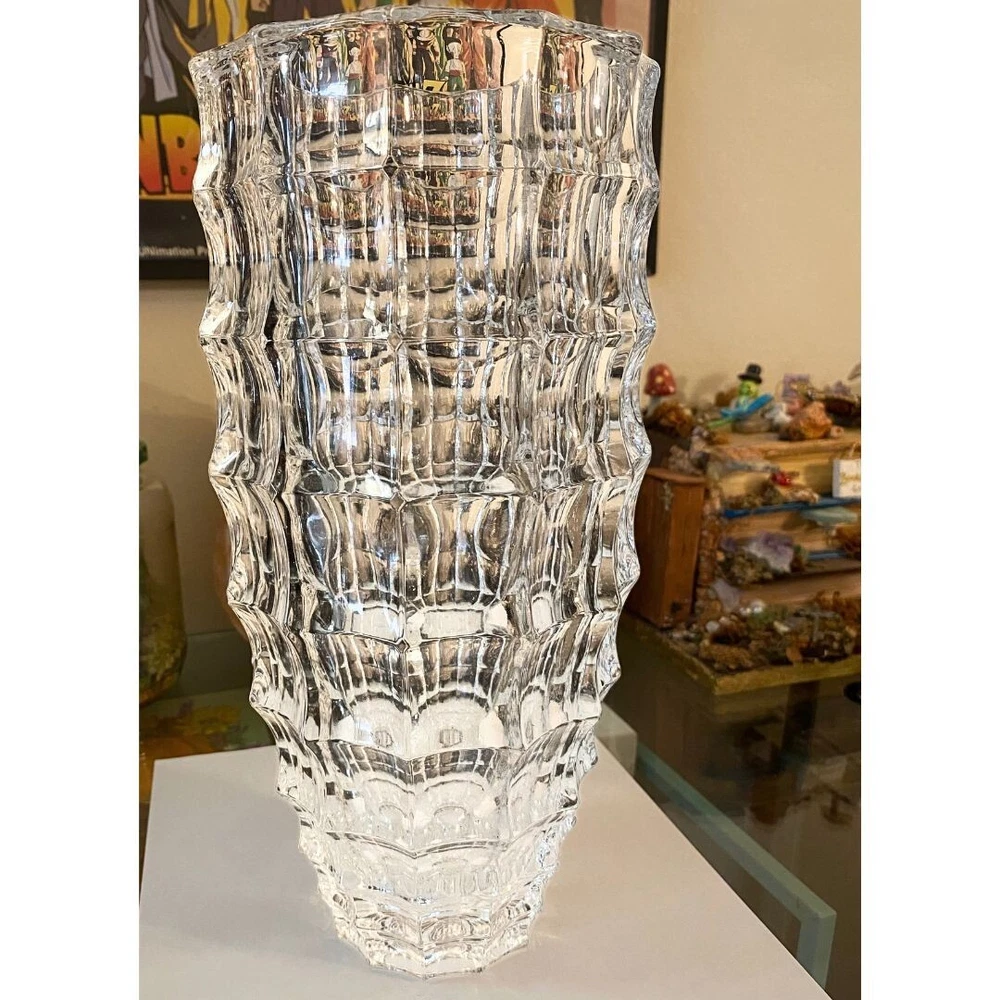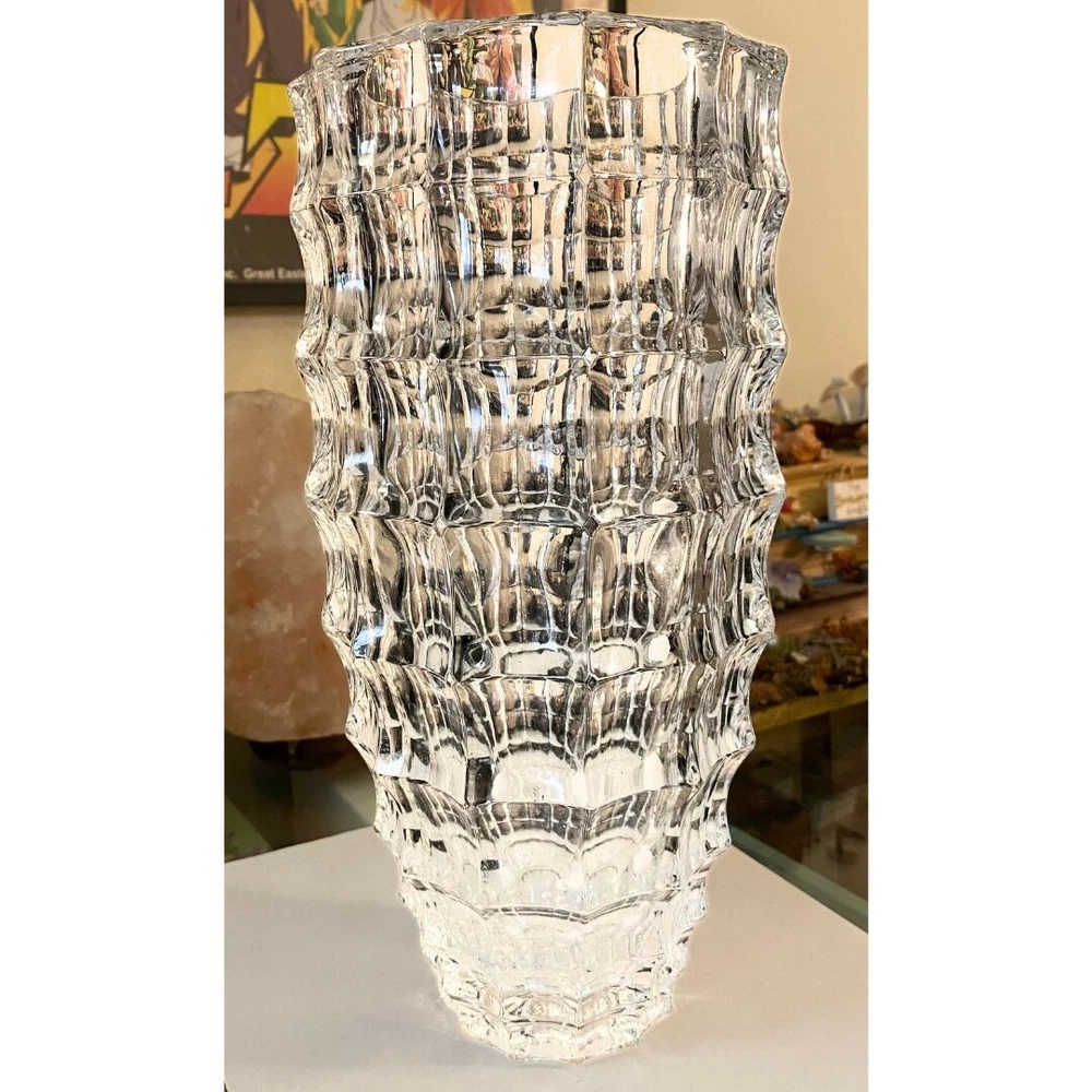 This is a large round crystal vase by Godinger in the "In the Window" pattern. It features a contemporary style with a geometric pattern and textured finish. The vase is waterproof and suitable for indoor use. It is adorned with crystals and has a clear color. This 6.8-inch tall vase is designed for all occasions and is perfect for adult use. It weighs 6 pounds and is part of the 21st Century era. No cracks, or scratching, but there are two minor chips on the bottom of the vase which are pictured in this listing. Please see the photos for visuals.
