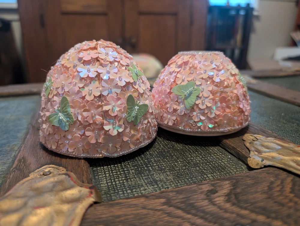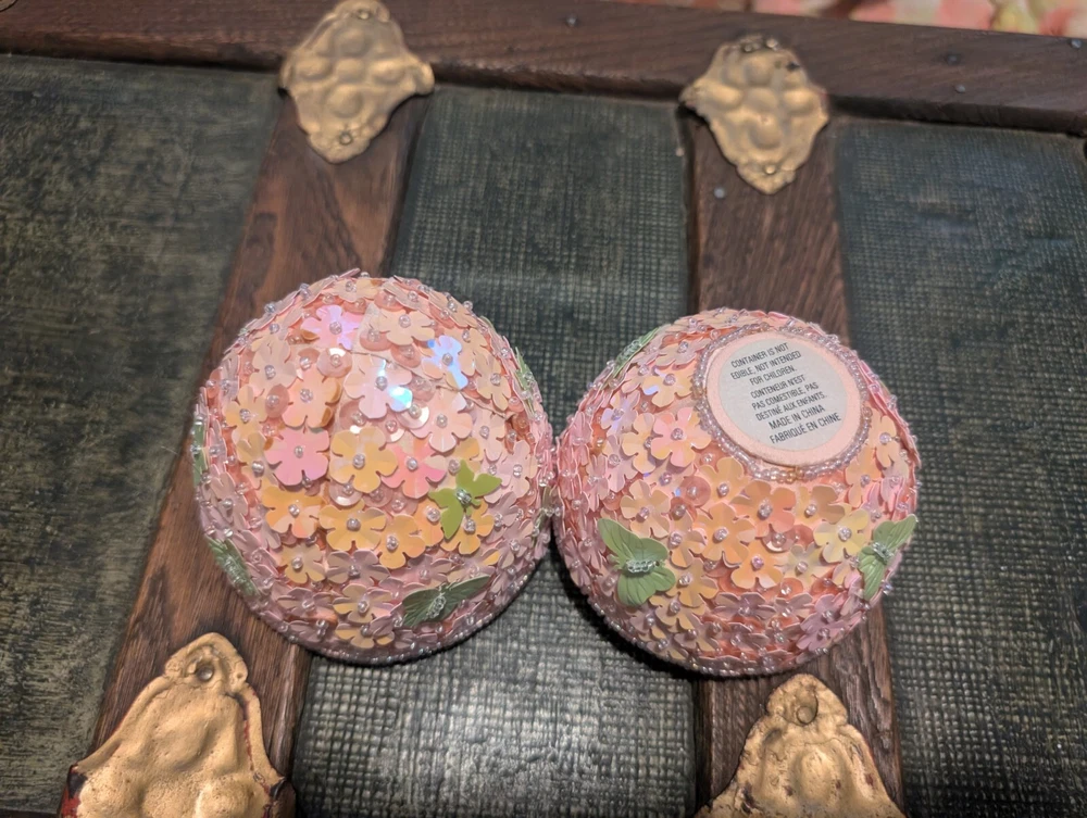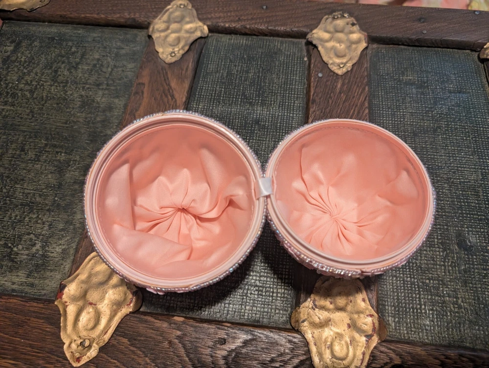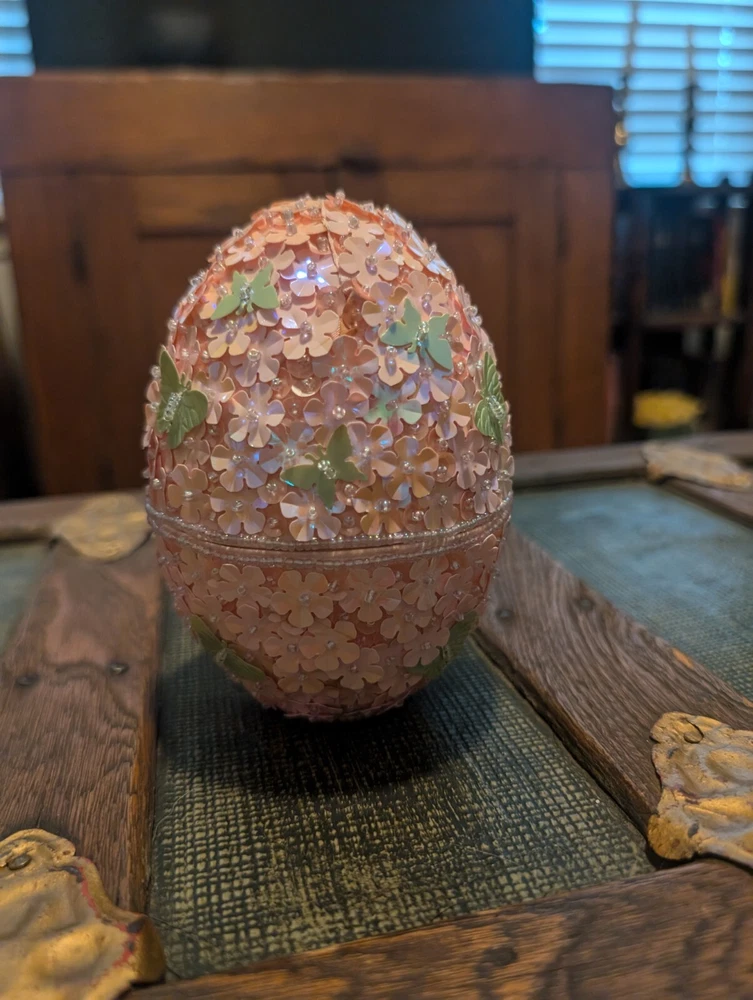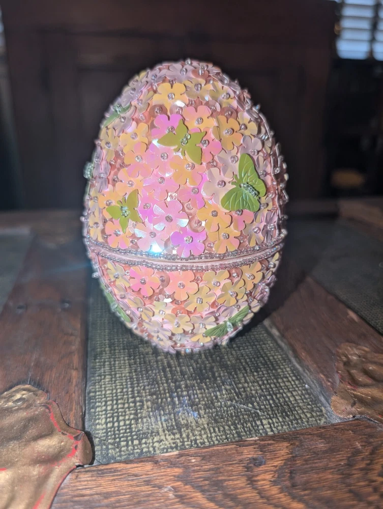 Godiva Pink Beaded Easter Egg, very rare. Item is used but in excellent condition. Beautiful pink trinket box with green sequin butterflies. 5" tall. 4" across.