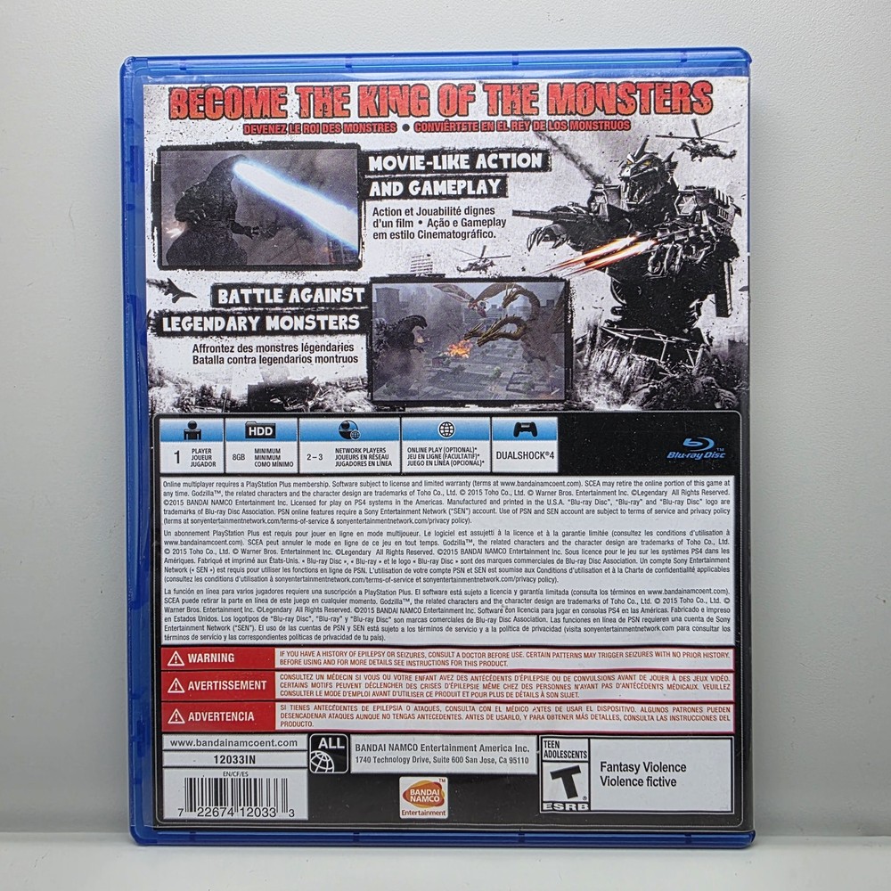 Release Year: 2015 Region Code: NTSC-U/C (US/Canada) Platform: Sony PlayStation 4 eBay Product ID (ePID): 208133003 Publisher: Bandai MPN: 12033 Game Name: Godzilla Rating: T-Teen Genre: Action & Adventure