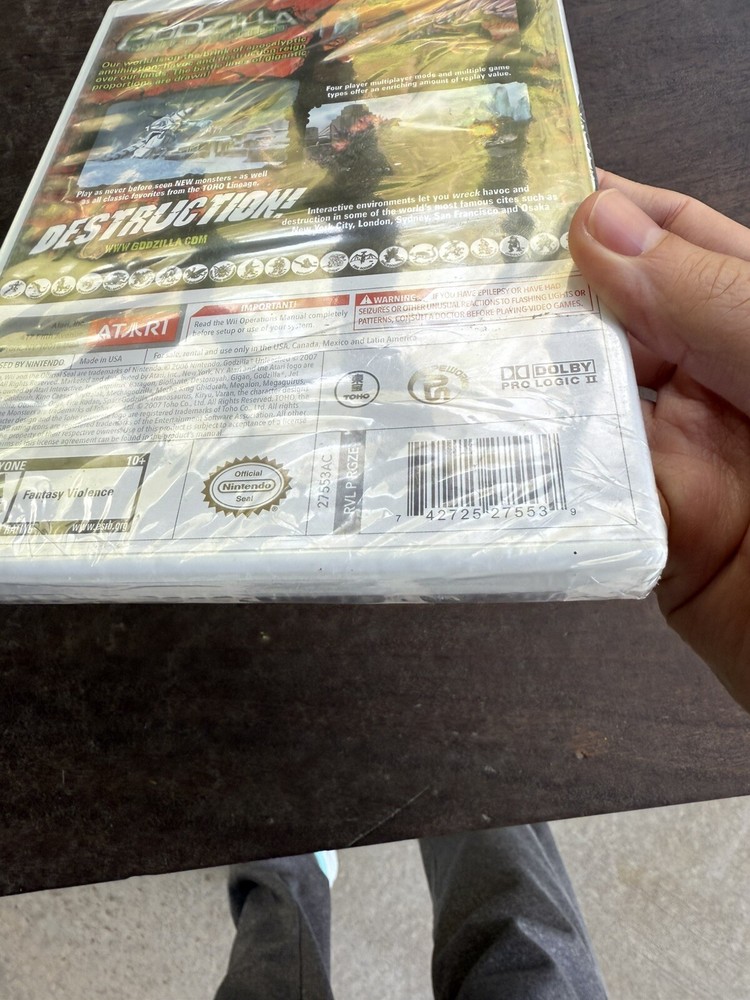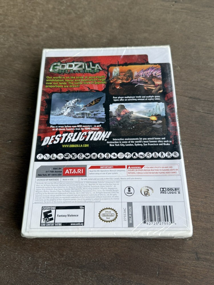 Platform:Nintendo WiiCountry/Region of Manufacture:USANumber of Players:1-4MPN:742725275539Rating:E10+ (Everyone 10+)ESRB Descriptor:Fantasy Violence_desc_:"Godzilla: Unleashed" for the Nintendo Wii is a fighting game on a colossal scale. Go ahead and unleash citywide damage with one of the 23 monsters available, including two Toho monsters that are entirely new for the game. Use a wide assortment of moves, including breath attacks, somersaults, and tail whips to destroy everything in sight. In addition to destroying things, players get to make and break alliances throughout the storyline and choose whether to gather an army or go it solo. For real multiplayer mayhem, party modes support up to four players for fierce social battles. Build up a critical mass meter in order to increase your monster's size and power for a limited time.brand:Atari Inc.Genre:Action & Adventuregtin13:0742725275539Control Elements:Gamepad/JoystickRelease Year:2007Game Name:Godzilla: UnleashedUPC:0742725275539Publisher:Atari Inc.