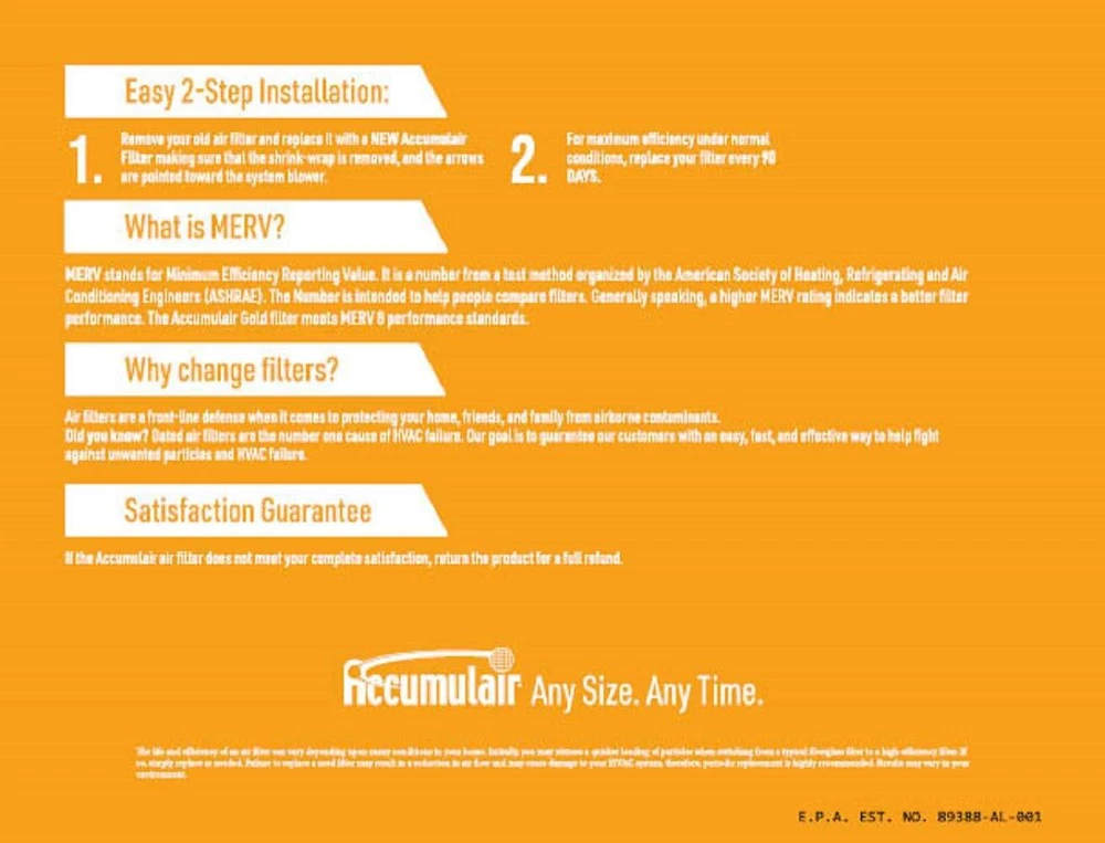 The Gold 8x14x1 air filter is designed to provide high-efficiency filtration with a low resistance to airflow. The 100% synthetic media is designed to capture small airborne particles that containment your indoor air. To increase durability, the pleated media is laminated to a metal backing that is recyclable, galvanized, and corrosion-resistant. The filter contains media that has been tested to perform at the Minimum Efficiency Reporting Value of 8 (8) by an independent lab according to ASHRAE Standard 52.2. The filter is equipped to enhance air quality by capturing up to 76% of common airborne particles such as dust, lint, dust mite debris, dust, standing dust, small fibers, and other airborne contaminants. All data and statements are indicative of typical properties and characteristics obtainable. claims are to be used as a guide for general comparison and not as a specification. CLEANER INDOOR AIR: The Gold 8 Electrostatic Pleated HVAC Furnace Air Filter is designed for residential or commercial use to improve and freshen indoor air quality by reducing airborne contaminants and intruding microscopic particles. This filter is with almost any brand and is appropriate for use in air conditioners, furnaces, heat pumps and HVAC units. TRAP AIRBORNE CONTAMINANTS: This pleated air filter is as 8, meaning it captures up to 75% or more of airborne contaminants such as pollen, dust mite debris, smoke particles, pet dander, dust, lint, dust, small fibers, etc. BETTER PROTECTION FOR YOUR HOME AND FAMILY: The pleated electrostatic media provides a high filtration efficiency without compromising your system's airflow. This air filter is ideal for residential homes, small commercial businesses and workplaces. REPLACE EVERY 90 DAYS: This air filter was designed to last up to 90 days. Please note, more frequent changes might be required for home owners with pets, children, or allergies. Regularly changing your air filter keeps your air clean and reduces the strain on your heating and cooling system or HVAC unit! PROUDLY MADE IN THE USA: Each air filter is manufactured and assembled here in the USA. Replacing or installing the filter is simple! First, carefully remove the old filter. Remove the plastic wrap and paper insert from your new filter. Insert the filter so the arrow on the side of the frame the direction of airflow.