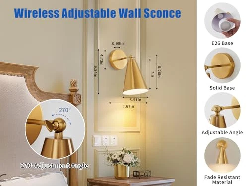 Return Policy Fast Delivery Trusted seller Gold Battery Operated Wall Sconces with Remote, 5000mAh Rechargeable Battery Powered Wall Lights, Color Temperature, Dimmable,Wireless Wall Mounted Lighting for Bedroom Bedside, 1 Pack Product Description 【Conical Shape & Adjustable Swing Arm】The Battery Operated Wall Sconce adopt modern simple golden conical lamp shape, smooth lines, is the perfect choice for decorating space. In addition, the lamp holder of the brass wall sconce can adjust the lighting Angle by 270°to meet all your lighting needs. Cordless wall light is suitable for bedside, corridor, living room, bedroom, farmhouse, dining room, kitchen, dining room, etc. 【5000mAh Rechargeable Wall Sconce】The battery powered wall lamp uses 5000mAh rechargeable bulbs with E26 bases and can be charged with Type-C USB interface Type. The brightness of the bulb reaches 300 lumens, which is very bright. Battery life of up to 30,000 hours, It can be fully charged in 4-5 hours, provide up to 30 hours of illumination. The bulb can be controlled by remote control or by pressing the bulb button directly. 【Color Temperature Adjustable & Easy to Install】The light bulb equipped with the vintage wall lamp set of 2 can be adjusted for brightness, also adjust 3000K warm light/4500K neutral light/6500K white light. The bedroom wall sconces is installed wirelessly, no electrician is required, just install the wall lamp with the included hardware. 【Remote Control & Timer & Night Light】This wireless wall sconce with remote control, which can be controlled within 4 meters. The remote control wall sconce also has a night light mode which is suitable for sleep, in addition to the timing function, you can set 30min/1H/2H timing in advance, and automatically shut down after you fall asleep. 【 Good After-Sales Service】 modern wall sconces quality is strictly controlled, we aim to provide you with a good lighting experience. If t are any problems in the use of the wall lamp, please contact us in time, we will provide after-sales service within 24 hours! Shipping Returns Payment Shipping Shipping is FREE to all addresses other than APO/PO boxes in the lower 48 states. All our stock ships from US-based warehouses. Shipped via USPS or UPS (depending on location and package weight) Unless stated otherwise, all orders will ship within 24-72 hours of your payment being processed. Check our feedback to see the great reviews of FAST shipping we offer. Returns Seller does not accept returns Payment We currently accept payment via eBay managed payments only. Once payment is cleared, we will dispatch your shipment within 1-3 business days. Please refer to the "Shipping" tab for more information regarding shipping speed to your destination.