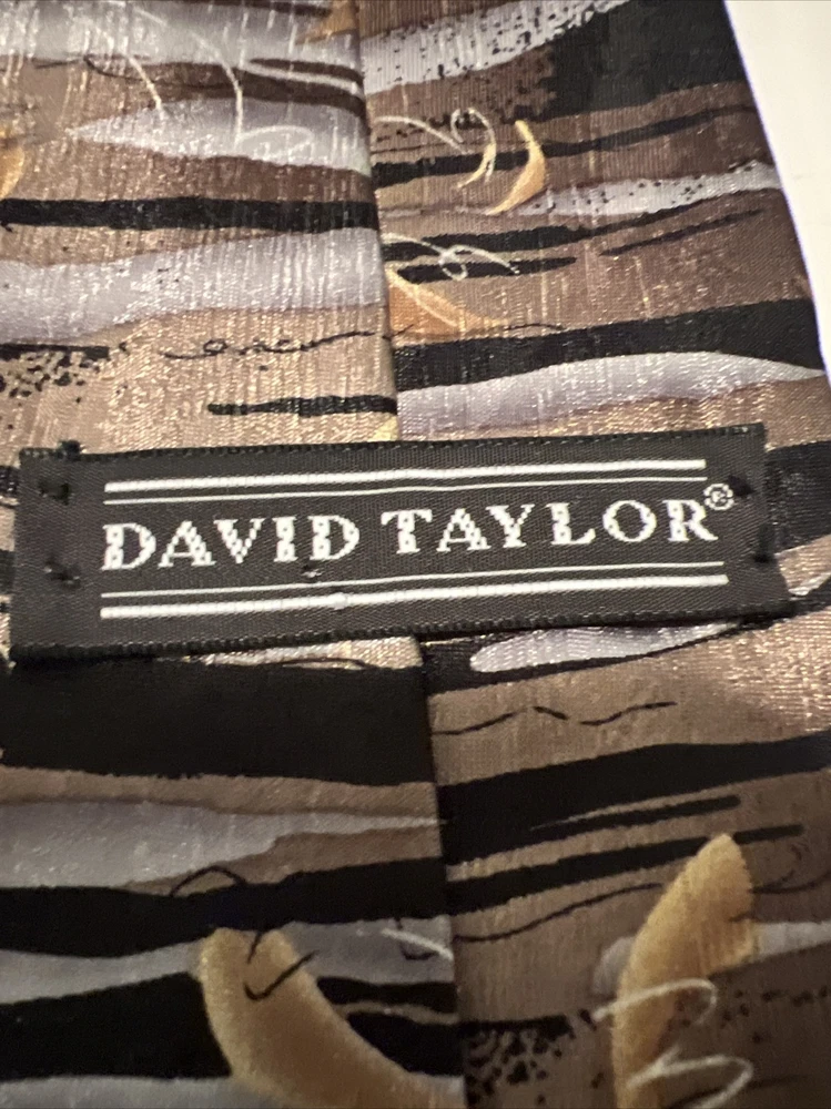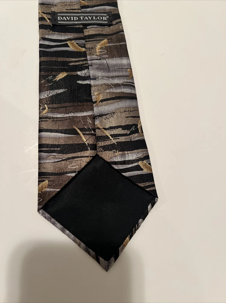 Elevate your style with this stunning David Taylor necktie. The tie features a unique geometric pattern in gold, black, and silver, making it a perfect addition to any outfit. The tie is made of high-quality polyester material and measures classic lengths (57"-60") and widths (3 1/2"-3 3/4") for a comfortable fit. The tie also features a subtle logo accent, adding to its overall appeal. Whether you're dressing up for a formal event or adding some flair to your everyday work attire, this necktie is sure to make a statement.