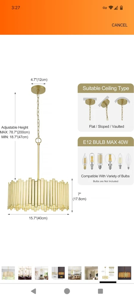 Listed on Amazon for $194.99 Gold Chandelier 4-Light, Pendant Lighting Fixture with Tiffany Glass Shade, 16” Brand Wrlmfy Color Gold Material Glass, Metal Style Mid-Century Modern Light fixture form Chandelier Room Type Foyer, Dining Room, Entryway, Kitchen Island, Bedroom, Stairwell, Living Room, Cottage, Hotel, Farmhouse, Villa, Cafe Bar, Restaurant Foyer, Dining Room, Entryway, Kitchen Island, Bedroom, Stairwell, Living Room, Cottage, Hotel, Farmhouse, Villa, Cafe Bar, Restaurant GOLD DRUM CHANDELIER - Tiffany drum chandelier features a metal shade and white glass finish. This bright, hanging lamp will beautifully illuminate your home, the striking chandelier is a contemporary art piece that gives off strong modern and artistic vibes. ADJUSTABLE CHAIN for SPACE - Round Hanging Light Size: 16"Dia x 19"H. Canopy Size: 5"D x 1"H, available for flat, slightly sloped, or vaulted ceilings. The 59" height chain is adjustable to be placed in your desired position from Min 22" to Max 79" from ceiling to bottom. DIMMABLE & BULB REQUIREMENT - This modern chandelier is dimmable when works with a dimmer switch and dimmable bulbs (BOTH NOT INCLUDED). The chandelier needs 4 x E12 (Base) max 40W / TypeB (Bulb Shape) bulbs, and the working voltage should be 120V. EASY TO ASSEMBLE - The 4-Light drum pendant lighting only works indoors and in a dry environment. It arrives part assembled, all mounting hardware and detailed instructions are included for quick and easy installation. Please carefully read the user manual before you are ready to install. CUSTOMER CARE - White chandelier light fixture fits for Bedroom Dining Room Kitchen Entryway Living Room.
