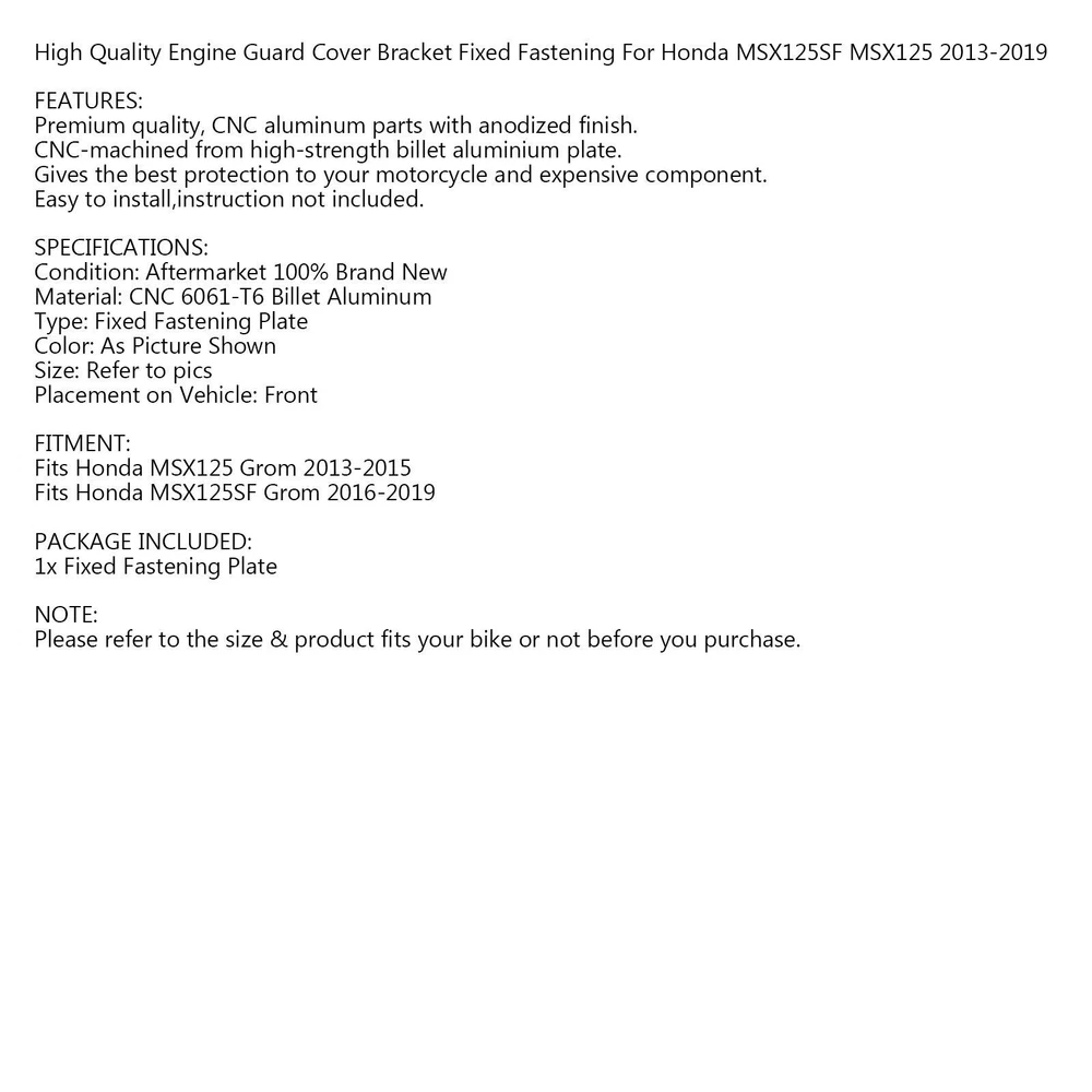 You may also like ABS Front Side Headlight Panel Cover Fairing Cowl For Kawasaki Z650 2017-2019 44.85 USD Free shipping Rear Tail Light Seat Cover Fairing For Suzuki GSX-S 1000 2015-2020 Black 48.85 USD Free shipping 223PCS Fastener Clip Screw Bolt Set Motorcycle Sportbike Windscreen Fairing 38.85 USD Free shipping Steering Horn Head Cover fairing Tie For VESPA GTS300 GTV300 2019-2022 Yellow 48.85 USD Free shipping Front Wheel Crash Protect Axle Guard A-Chrome Fit For Bmw R18 Glassic 2020-2021 41.85 USD Free shipping 5MM M5 THREAD ZINC PLATED SPRING SPIRE C CLIPS U NUTS SPEEDCLIPS CHIMNEY QTY 10 9.36 USD 9.85 USD Free shipping 5% off Engine Guard Gearbox Transmission Cover For Vespa Sprint Primavera 150 White 32.85 USD Free shipping Battery Side Cover Fit for Honda VTX1300 R/S/C/T 2003-2009 60.85 USD Free shipping Rear Tail Side Seat Panel Fairing Cowl for Honda CB650R CBR650R 21-22 32.85 USD Free shipping Plastic Engine Protector Covers Fairing Titanium For Bmw S1000Rr 2020-22 2021 52.85 USD Free shipping Front Nose Fairing Beak Fender Cover For BMW R1200GS / ADV 2014-2018 Iridium 229.85 USD Free shipping 10pcs Fairing Panel Bolt Clip 6mm Plastic Screw Rivets Clips Black For Honda 9.36 USD 9.85 USD Free shipping 5% off High Quality Engine Guard Cover Bracket Fixed Fastening For Honda MSX125SF MSX125 2013-2019 FEATURES: Premium quality, CNC aluminum parts with anodized finish. CNC-machined from high-strength billet aluminium plate. Gives the best protection to your motorcycle and expensive component. Easy to install,instruction not included. SPECIFICATIONS: Condition: Aftermarket 100% Brand New Material: CNC 6061-T6 Billet Aluminum Type: Fixed Fastening Plate Color: As Picture Shown Size: Refer to pics Placement on Vehicle: Front FITMENT: Fits Honda MSX125 Grom 2013-2015 Fits Honda MSX125SF Grom 2016-2019 PACKAGE INCLUDED: 1x Fixed Fastening Plate NOTE: Please refer to the size & product fits your bike or not before you purchase. -About US Founded in 2012, VIPJQ have professional development and sales, and are involved in various products, providing customers with various high-quality products. Since its establishment, VIPJQ has always adhered to the service concept of "customer first" and the management concept of "pursuit of quality", and is committed to providing customers with high-quality original designs. We commit to provide you the best innovative, quality products & professional services with competitive prices. We value every customer, and we look forward to providing solutions for your business needs to help your business achieve its goals, please contact us immediately! We are all about you! We are a Japanese seller,but with large warehouse in USA. We are profesional on Auto Parts,Car Parts,Motorcycle Parts,3C,other hot sale items and so on. We aim to provide to customers high quality product and best service. -About Shipment&Returns The item usually will be dispatched within 3 days after you ordered.All are free shipping. And it usually takes 3-10 working days to delivery depends on buyers' address or other majeure on the way. If you are not satisfied with the items and want to return the item,we hope you could message us first,we will give you the return details, we think we could give you the best service to save your time and money.Thank you. -About Feedback&Customer Service If you are enjoy your shopping here,not only enjoy the items but also the service,we are appreciate you could give us a 5-star feedback. If you are not satisfied with the item,before you give us the negative feedback,we hope we could give you the best solution through our commutication. We think we could do it if you give us the chance.Thank you.