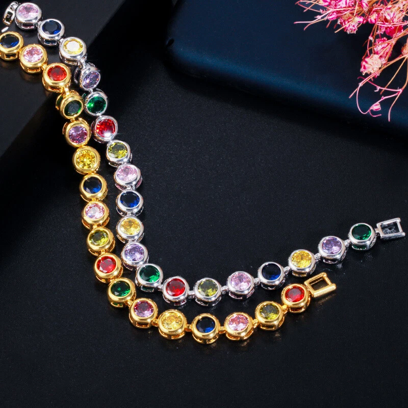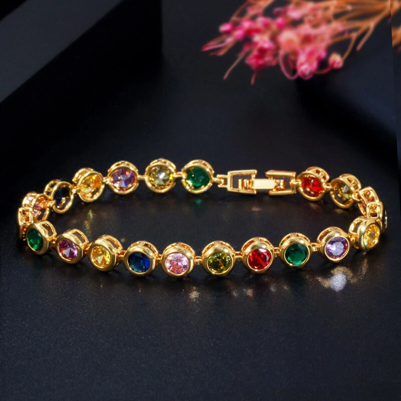 Gold Plated CZ Multicolored Women Round Tennis Bracelet Wristband Chain Jewelry Specifications: 1. Condition: New 2. Material : Cubic Zirconia 3. Bracelet Length :18 cm + 2.4 cm extended clasp Features: 1. Cubic Zirconia High Quality Material - Diamond-like Brilliance , Prong Setting and CZ Stone are stable. 2. It will be an Ideal Gift for Your Girlfriend, Wife, Fiancee, Daughter, Mother, Your Special Someone, or just Yourself. 3. Wearing Occasion: Daily wear, Shopping , Anniversary , Party , Wedding , Christmas , New Year , Valentine's Day ,etc. Package Includes: 1Pc Bracelet Payment Delivery details Terms of sales About us Contact us Payment 1. We only accept payment by Paypal 2. We request you pay within 5 days of the first auction close. Failure to do so may cause our automated dispute system to file disputes for unpaid items Delivery details We only send items to the registered eBay address.Items will be shipped within 2 business days from the date payment is received (not include public holiday and weekend) . As per eBay regulations, import duties, taxes, and customs charges are the buyer's responsibility. Please check with your country's customs office to determine what these additional costs may be prior to bidding or buying. Terms of sales After-Sale Please contact us to request a return/replace/refund authorization.It will be best if you use ebay message to contact me. 1, Return and replacement request is available only the requests within 30 days after parcel received. 2, Returning the item as the same condition as received. Situation and solution Defectives ---Please contact us and provide a photo of the defective part. After situation confirmed,we will offer you refund/return/replacement according to the situation Not as Described ---Please contact us and provide a photo of the wrong part. After situation confirmed,we will offer you refund/return/replacement according to the situation Not Received ---Please undersatnding shipping on the way was out of our control ,because of the busy shipping season,holidays,bad weather or force majeure etc. It may be delay for days. But if it took too much time and not deliveried, Please message me, I will offer you solution for it. About us Working time: Chinese time(Eastern eight zones):Monday to Friday ,9:00 am to 6:00 pm. We do not work on chinese legal holiday. Message reply: We will reply all messages within 24 hours of business time. Contact us Please contact us via ebay message, it was the best way for both you and us to solve problems. Any questions or anything you need, please feel free to contact us.