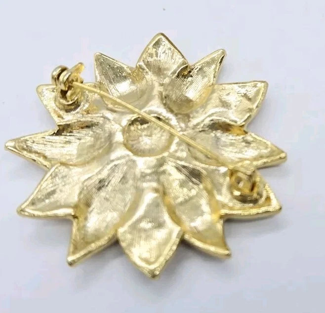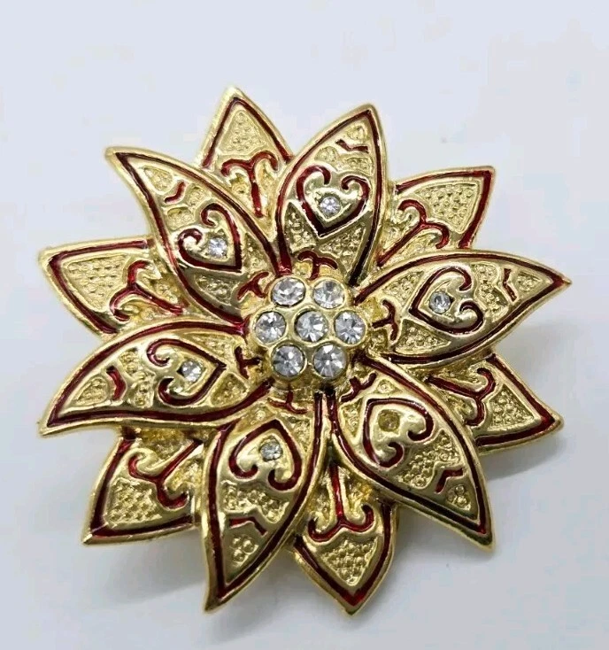 Gold Poinsettia Brooch Pin Red ENAMEL Christmas Crystal Accent 1.75" Holiday
