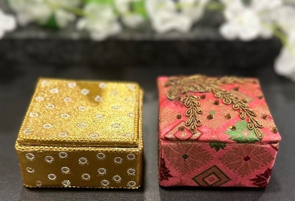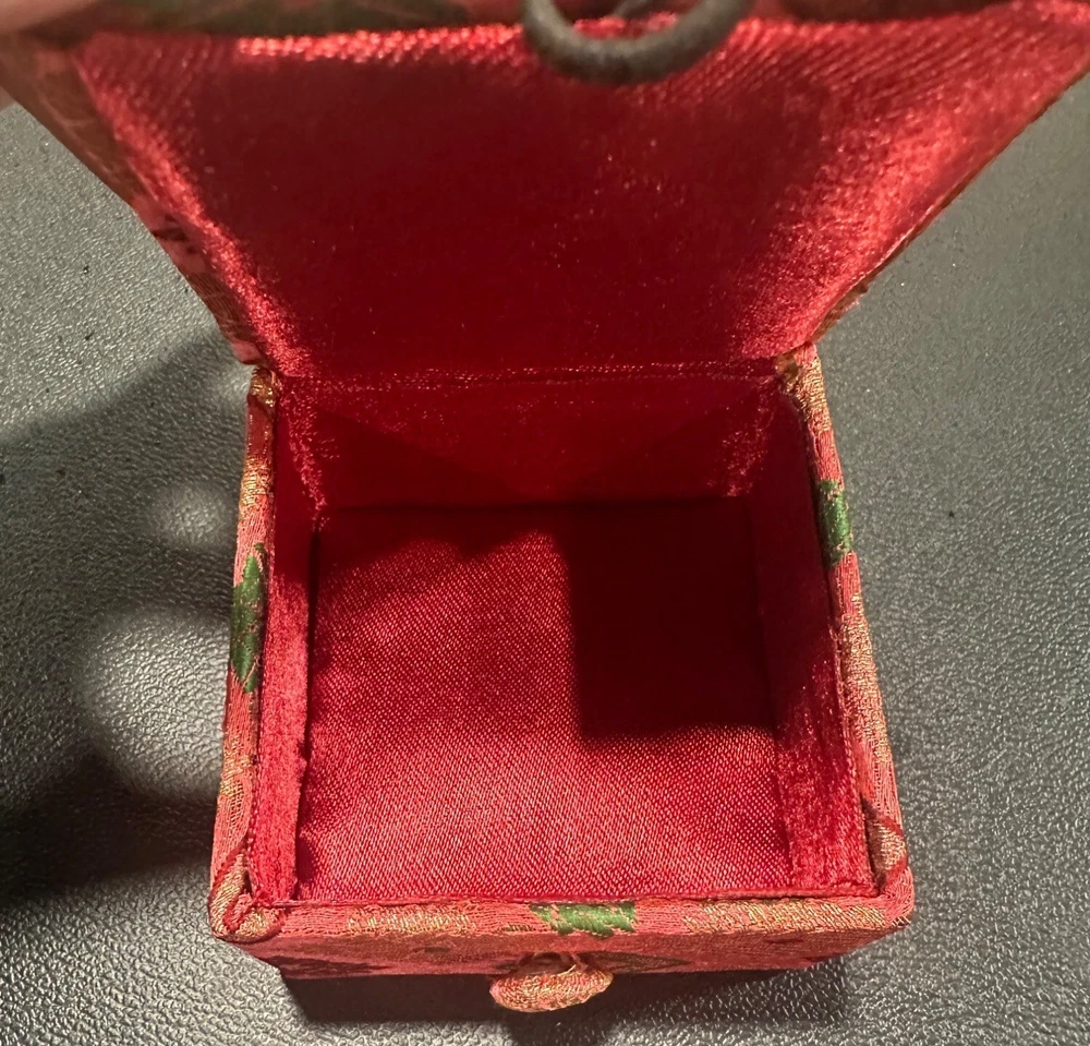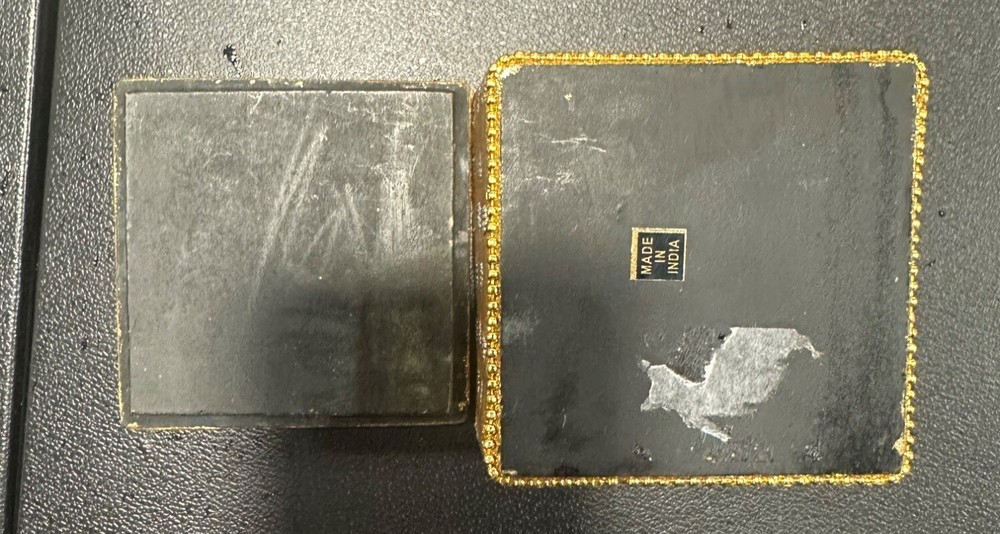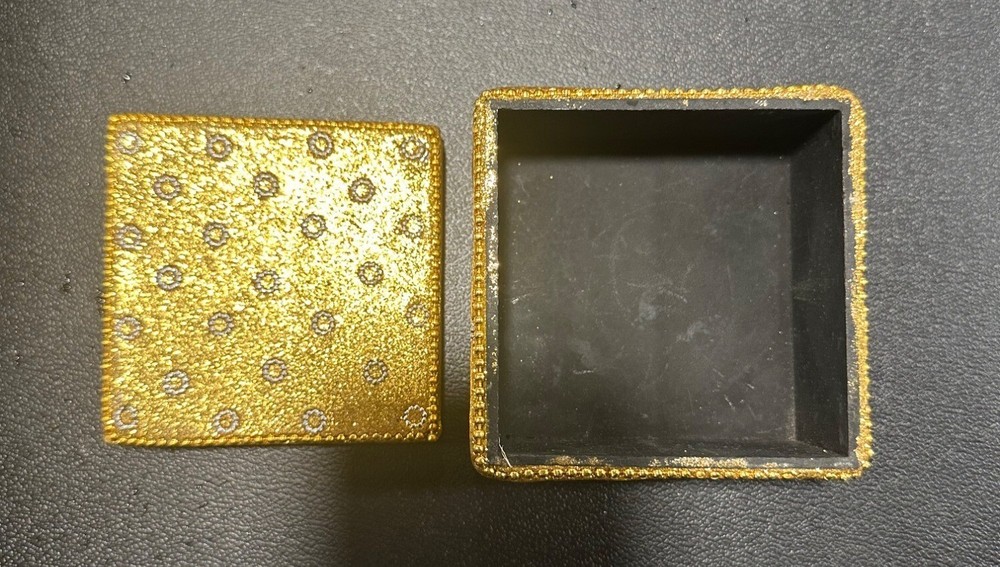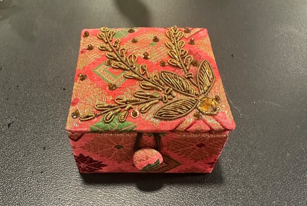 Add a touch of elegance to your space with these intricately designed boxes. Ideal for storing small treasures, they combine style and function. • Includes 2 square boxes • Gold box with glitter accents & red box with embroidery • Both feature removable lids • Handmade in India • Versatile storage solution Gold box bottom shows minor scuffing; red box interior clean. Size: S Condition: Pre-Owned Good Gold box has slight surface wear on the base. Red box in great condition Please see all photos as they are part of the description. Always open to reasonable offers! Jewelry is never cleaned as we want to preserve its timeless beauty and aging. Vintage items tell a story and we would like you to see that story. It also allows the new owners to clean in a way that is right for them.