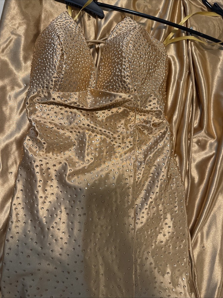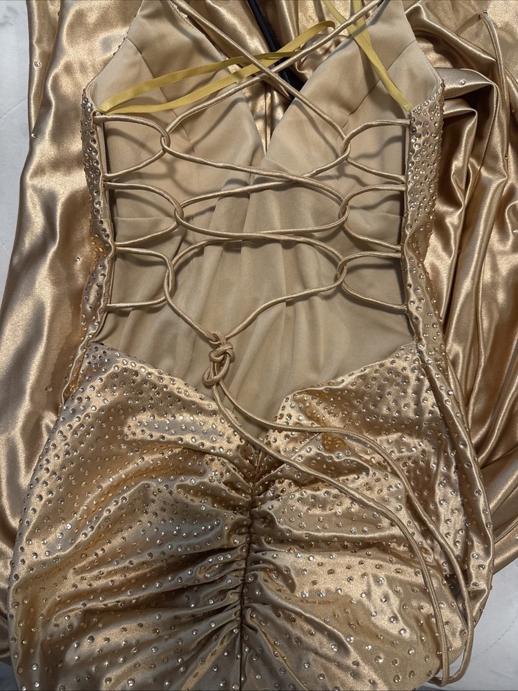 Details that shine: • Luxurious satin fabric that flows effortlessly with every step • Sparkling rhinestone embellishments that catch the light from every angle • Lace-up back for a perfect, adjustable fit • Ruched bodice & high slit that add drama and sophistication • Maxi length with a graceful train for a red-carpet finish 👗 Perfect For: Prom, formal dances, weddings, pageants, galas, or any event where you want to feel like the star of the night. With its radiant golden hue and shimmering details, this gown doesn’t just make an entrance—it makes a statement.
