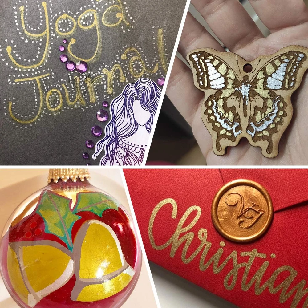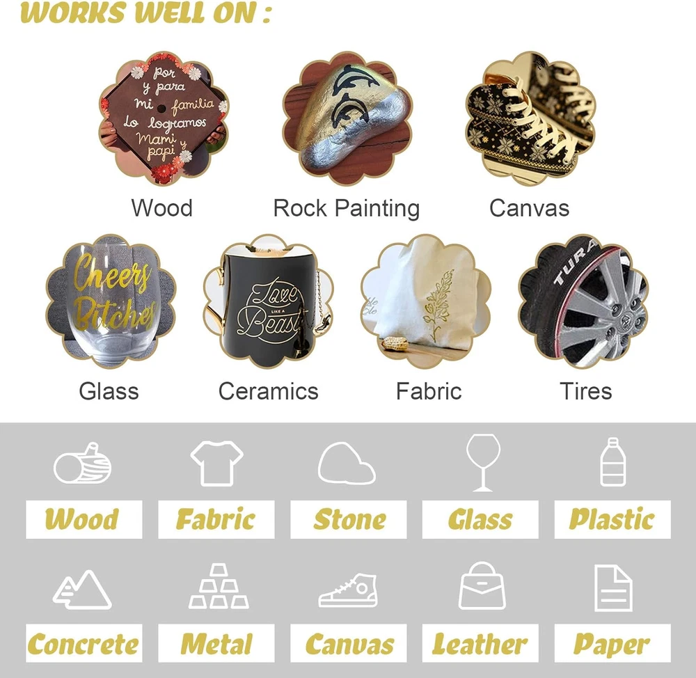 【High Quality and Safe】Package with 3 pcs Gold+3 pcs Silver color. Acrylic paint pens are made with high quality abundant oil ink, High purity color, strong covering force,waterproof, fade proof, non-bleeding. non-toxic, no odor, no strong smell. Conform to ASTM D-4236 & EN71-3. 【Mark on Dark and Light Color Surfaces】Eye-catching metallic shining contrast color, polarized color under light. Suitable for leave message and permanent sign. Paint markers for rocks painting, fabric, ceramic, glass, wood, plastic, leather, canvas, mugs, blackboard almost any solid surface. 【Fine Tip for Detail Marker】0.7mm fine tip markers, excellent for your fine line work, DIY craft projects or art drawing. Painting for chalkboard,card making, scrapbooking supplies. Write smoothly, drying quickly. 【Easy to Use】Tear off the plastic film. Shake well to mix paint. Keep press the tip until the ink exudates. You will see the change in the color of the nib from the ink flow. 【Purchase Without Risk】If you have any product problem or no satisfied with paint pens, please contact us via the buyer-seller message or e-mail. We will reply to your email within 24 hours. Product Description HOW DO I USE IT? In order to get the best results, it is important that the following instructions are followed. With cap on, shake well to mix paint. When you hear the ball rattle inside, you’ll know the paint is mixing. Press the tip to release the air. Then press the tip several times vertically until the ink exudates. Test on paper before use. Then enjoy painting on different surfaces. If the nib dries out, you can press it again. Recommended to cover the pen cap in time when not in use to prevent it from drying out.Better protection of the tip to extend the service life.