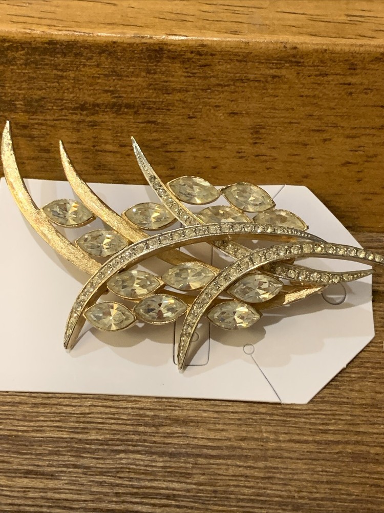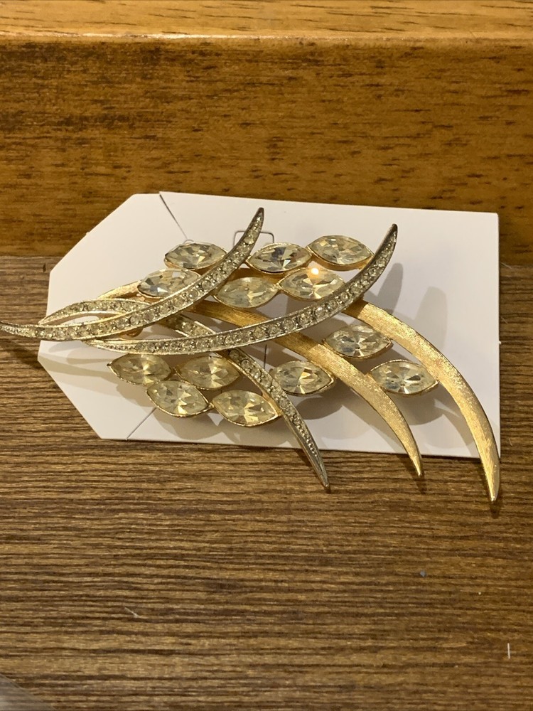 Gold Tone Clear Stone Brooch Mid-Century Modern Costume Jewelry Accessory
