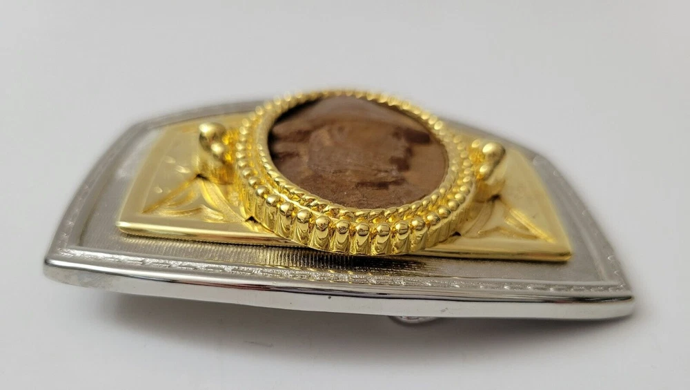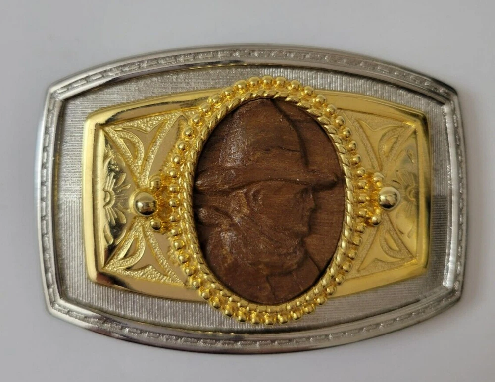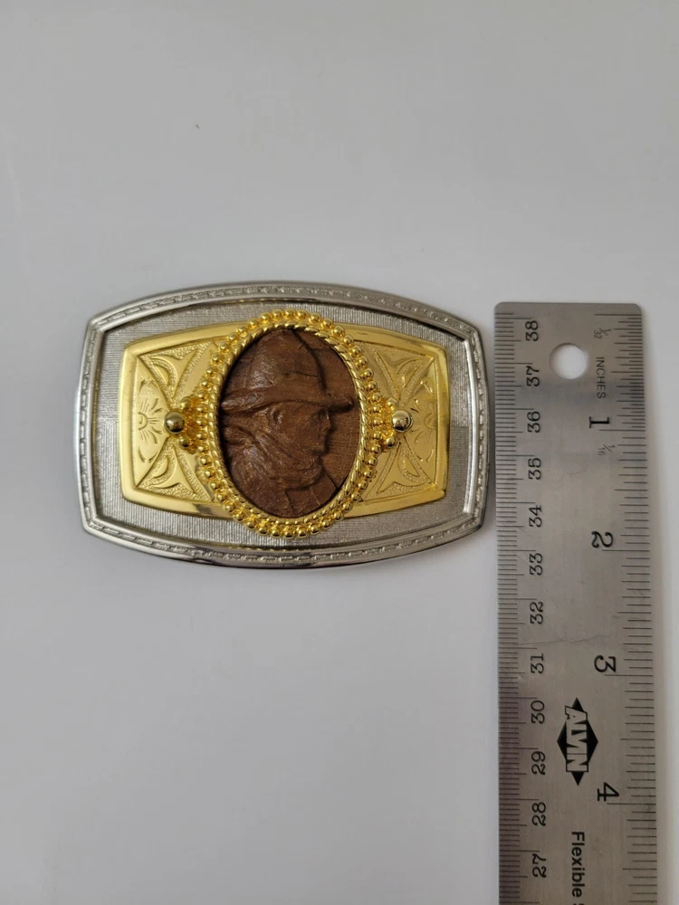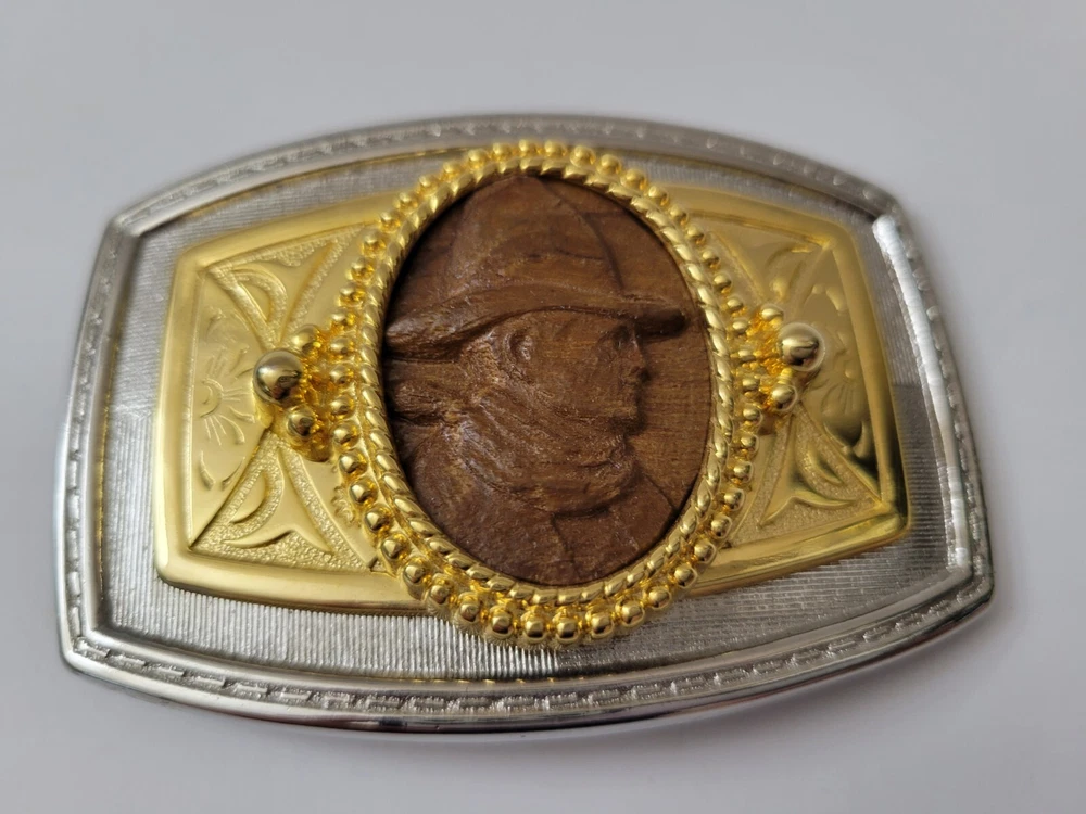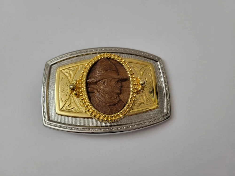 Gold and Silver Belt Buckle with Wooden Cowboy Portrait Metals Untested Each item is carefully packaged to prevent any damage and is shipped immediately with tracking.