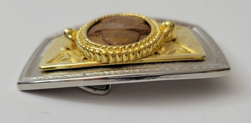 Gold and Silver Belt Buckle with Wooden Cowboy Portrait Metals Untested