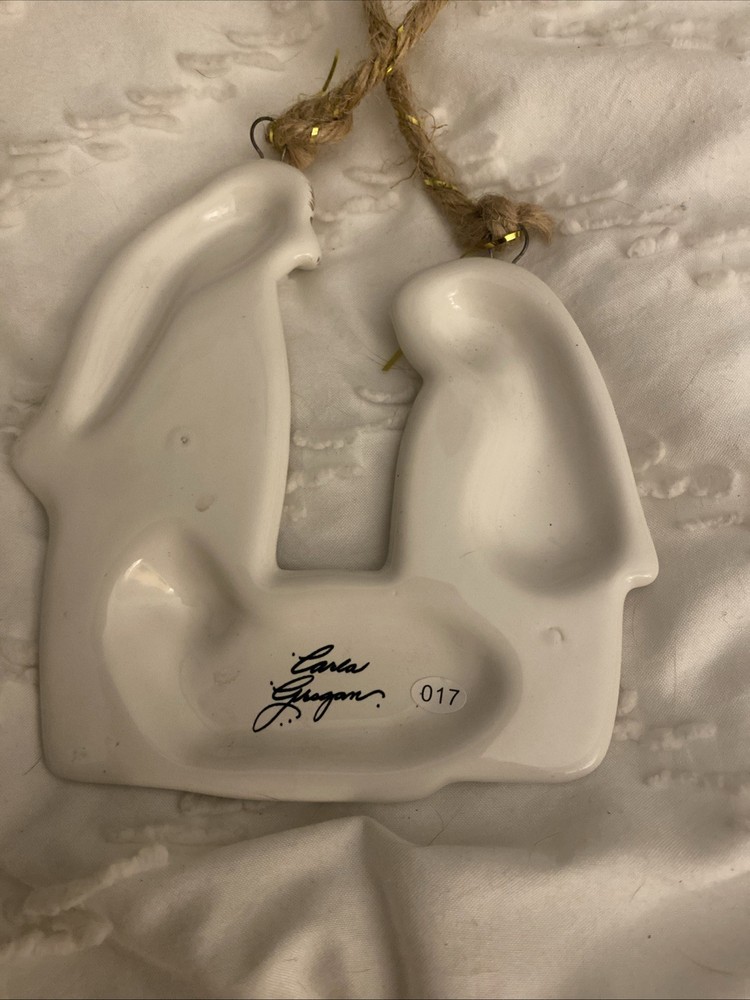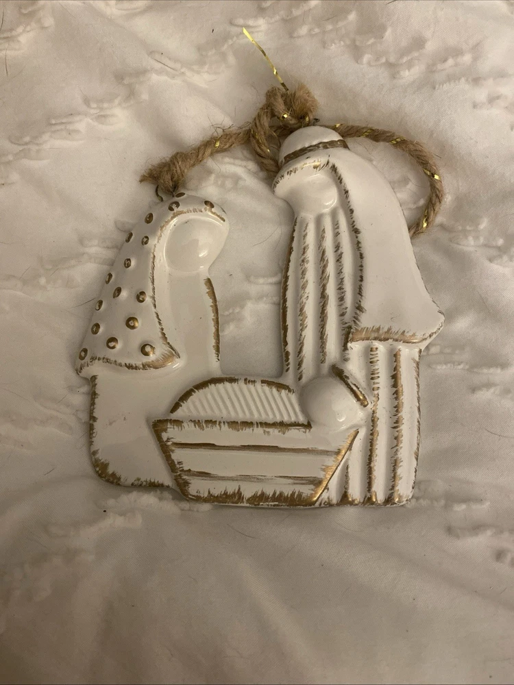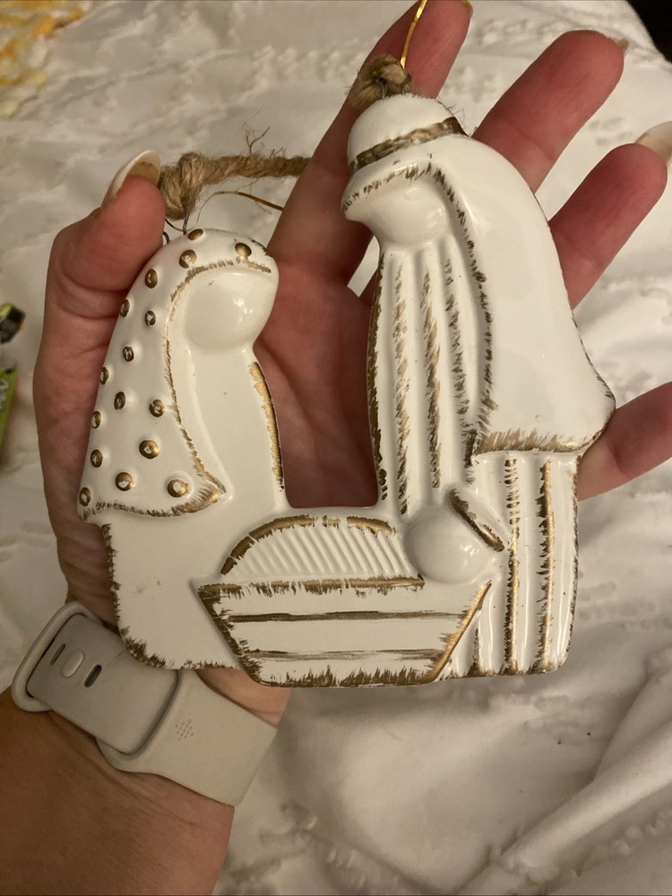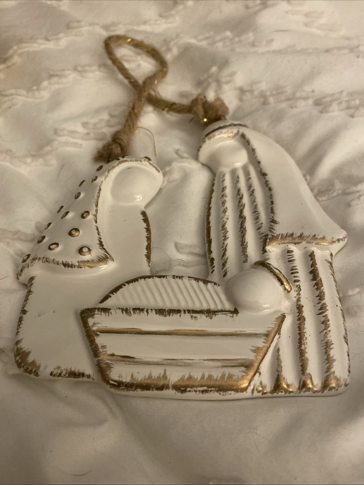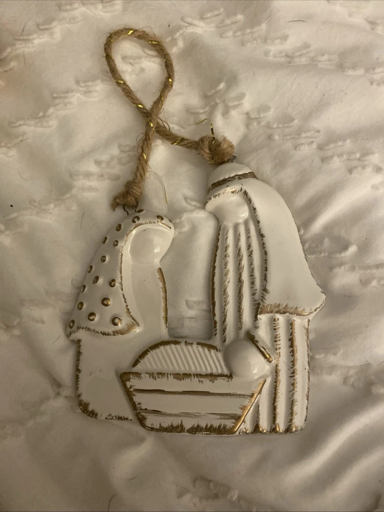 The Raised Ceramic Gold Accent Holy Family Christmas Ornament by B+B is a beautifully crafted hanging decoration perfect for the holiday season. Made from white, brown, and gold ceramic, this ornament features a Holy Family design that adds a sentimental touch to your Christmas decor. The gold accents on the ceramic base give it a luxurious look, making it a perfect addition to your holiday decorations.