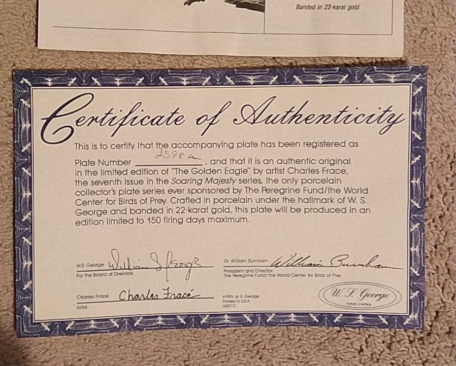 Elevate your collection with the Bradford Exchange Soaring Majesty collector plate, featuring the exquisite craftsmanship of Charles Frace. This 8.5-inch ceramic plate, from the 1991 series, showcases a majestic golden eagle in vivid, multicolor detail, capturing the spirit of wild animal themes beloved by collectors. The round shape and decorative style reflect the artistry of late 20th-century American pottery, making it a standout piece for any display. Complete with a stand for easy presentation, this collector's item embodies the production style of art pottery with a touch of historical significance. Whether you're commemorating special occasions or simply celebrating the beauty of nature, this plate is a timeless representation of both the Bradford Exchange legacy and the enduring allure of collector's items. You Will Receive The Item(s) Pictured. We Do COMBINE SHIPPING So Take A Look At Our Other Items. If You Would Like To Take Advantage Of The COMBINED SHIPPING Please Wait For Invoice Before Payment. If You Have Any Questions We Will Be Happy To Answer Them.