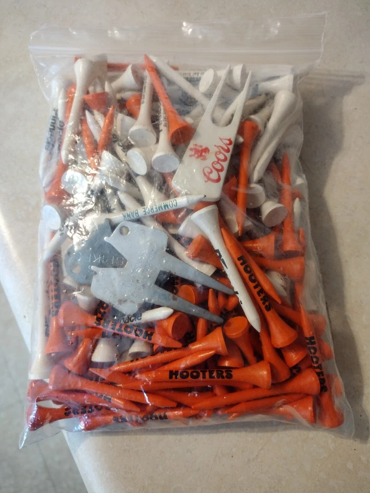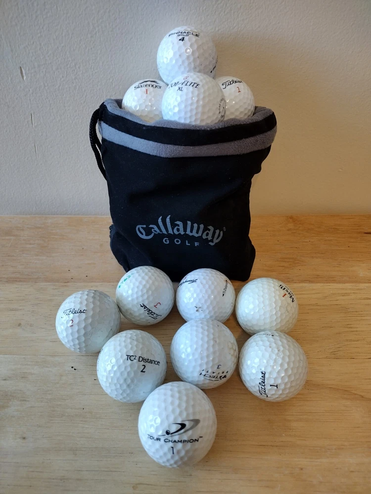 Two Dozen (24) assorted golf balls, Plus 4 Free items; a bag of new golf tees (Hooter's & Pinnacle's signed) a Rolex signed divot repair tool, and a Callaway 5 wood head cover, and a little Shriners clip on your bag charm.