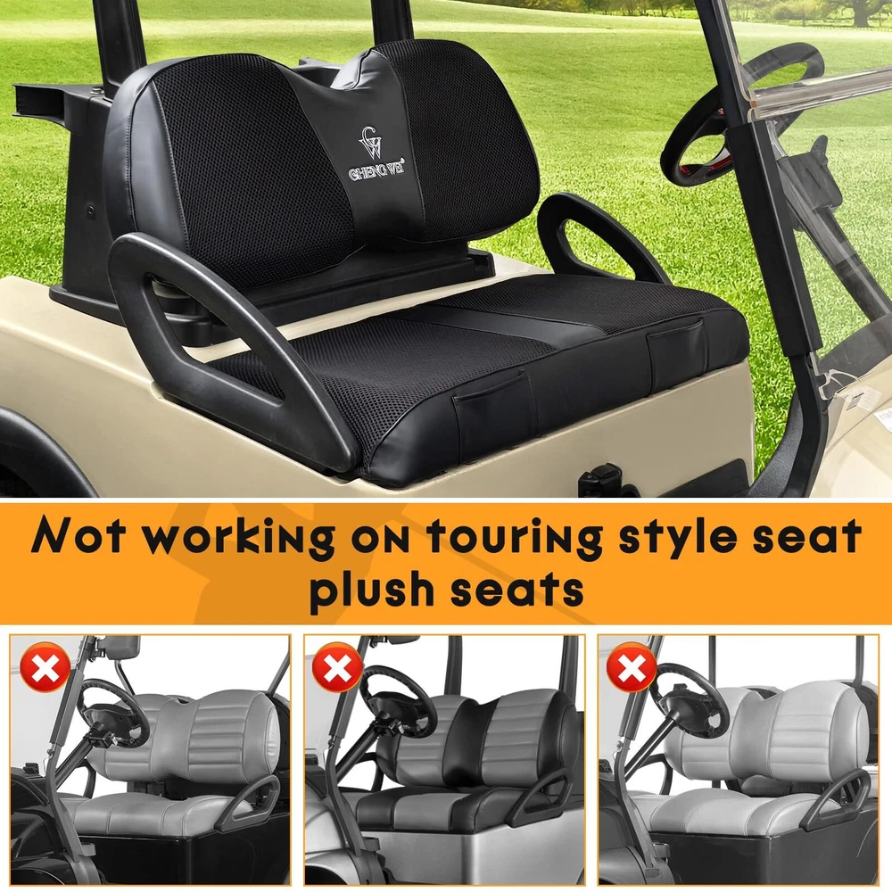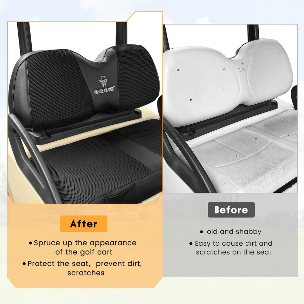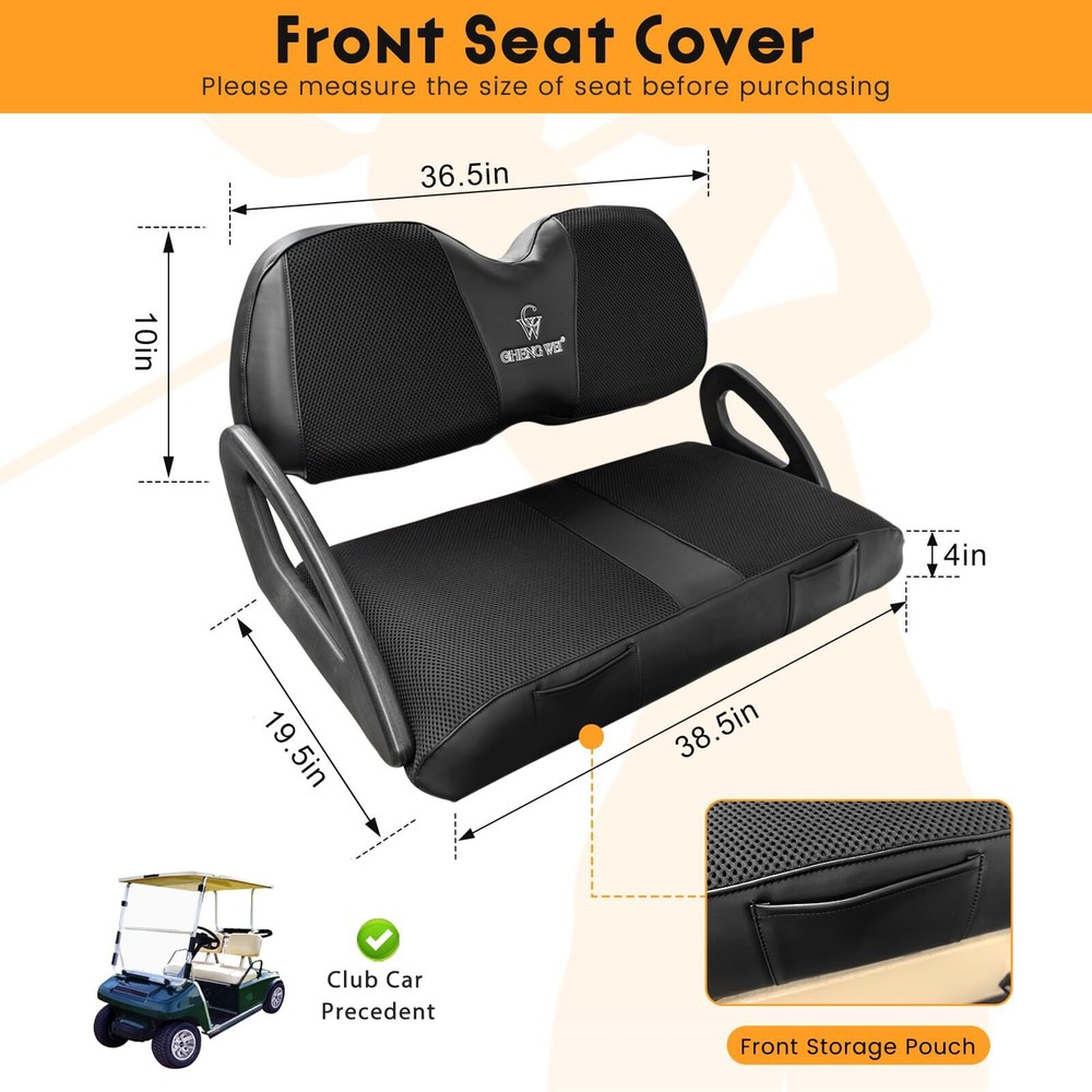Golf Cart Seat Covers for Club Car Precedent Front Standard Seat,Breathable Air Mesh and Leather,Adjustable Buckles and Drawstring No Nails Required,Front Storage Pouch(Black) 【Fit Models】Golf Cart Seat Cover for Club Car Precedent Front Standard Seat. Does not fit touring-style seats or plush seats. (Please verify your golf cart seat measurements before purchasing.) 【Premium Quality】 Fit club car precedent seat covers featuring distinctive mesh cloth with PVC Leather, our golf cart seat cover features a distinctive mesh design for enhanced breathability. Built to last, it withstands daily wear and tear while ensuring long-lasting durability and optimal performance. The precision fit eliminates wrinkles and loose areas for a seamless appearance. 【New Design】Our golf cart seat covers combine two premium materials to provide ideal temperature regulation - keeping you warm in winter and cool in summer for year-round comfort. 【Front Storage Pouch】 Designed with two spacious pockets, this front seat cover provides handy storage for your phone, keys, and other small items while driving. 【Easy to Install and Refreshing】 Installing our golf cart seat cover adjustable straps and retractable buckle design, which help you install and take down easily in few minutes, no need for using gun nail and removing the aged vinyl seat cover. A full set back and seat covers will fresh your aged golf cart seats Golf Cart Seat Covers for Club Car Precedent Front Seat Shipping We offer FREE shipping on all orders! We ship within Three business days of payment, usually sooner. We use a selection of shipping services such as UPS, FedEx, USPS etc. We only ship to the lower 48 states, no APO/FPO addresses or PO Boxes allowed. Local pickups and combined shipping options are not provided at this time. Return You can return a product for up to 30 days from the date you purchased it. Any product you return must be in the same condition you received it and in the original packaging. Please keep the receipt. Payment We accept payment by any of the following methods: PayPal Please pay as soon as possible after winning an auction, as that will allow us to post your item to you sooner! Feedback Customer satisfaction is very important to us. If you have any problem with your order, please contact us and we will do our best to make you satisfied. Contact Us If you have any queries, please contact us via ebay. We usually respond within 24 hours on weekdays. Please visit our eBay store to check out other items for sale! Thank you for shopping at our store.