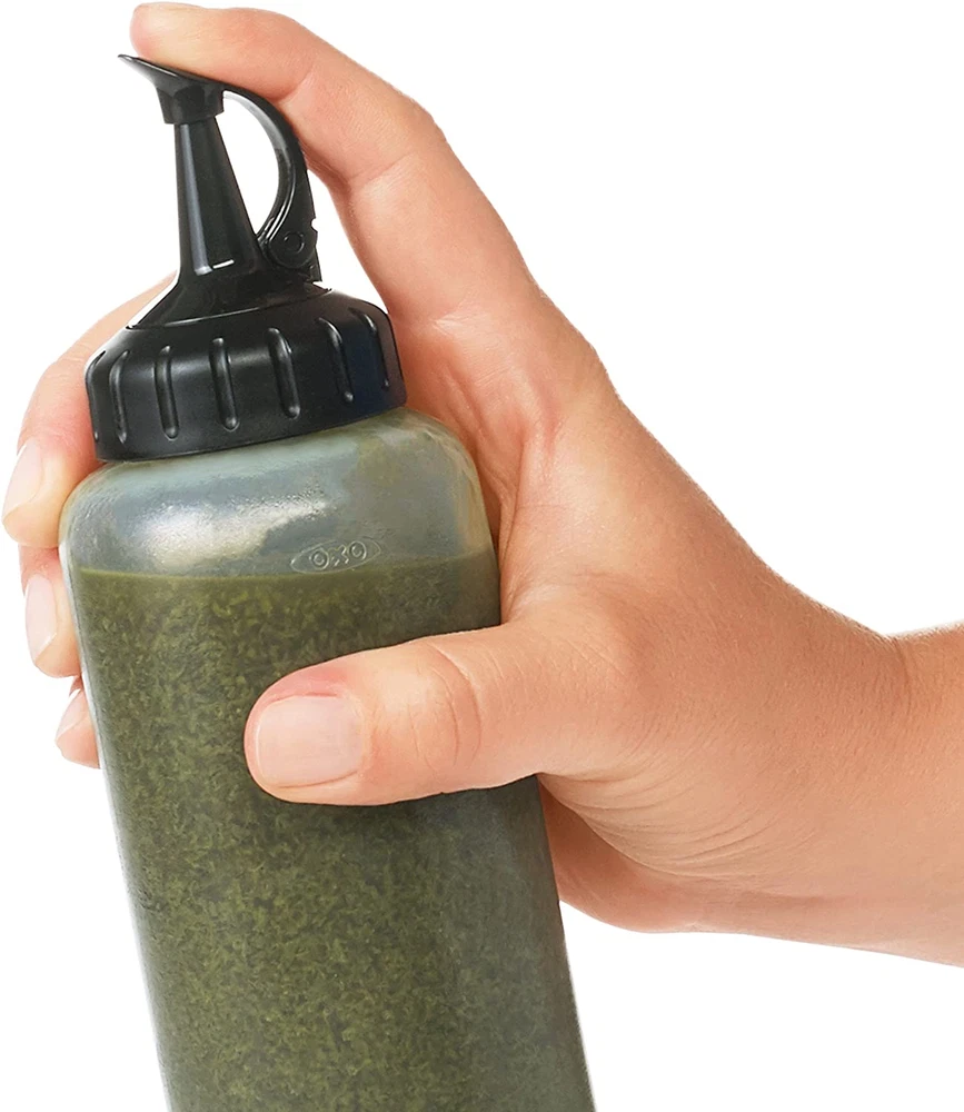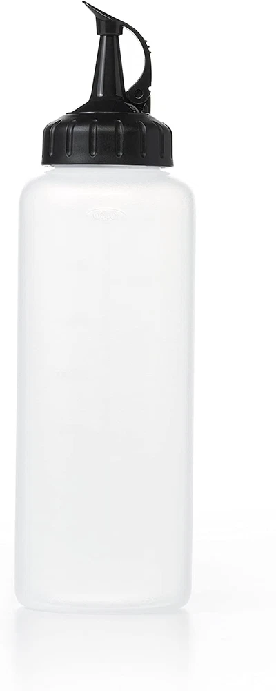 Unique attached cap stays open while you squeeze for a precise pour Cap snaps closed for shaking and convenient storage Durable, reusable Bottle is perfect for oil, vinegar, dressing, condiments, syrups and drizzling dessert toppings Bottle feature convenient measurement markings in cups, oz and mL BPA free Bottle comes apart for easy cleaning and is dishwasher safe Whether you’re adding oil to a pan, drizzling chocolate on a cheesecake, or squeezing ketchup on a burger, the OXO good grips chef’s squeeze bottles provide one-handed precision. Whether you need a thin tip for precision or a wide tip for thicker dressings and sauces, we’ve got you (and your squeeze bottle! ) covered with interchangeable lids, Each with a unique, attached cap.