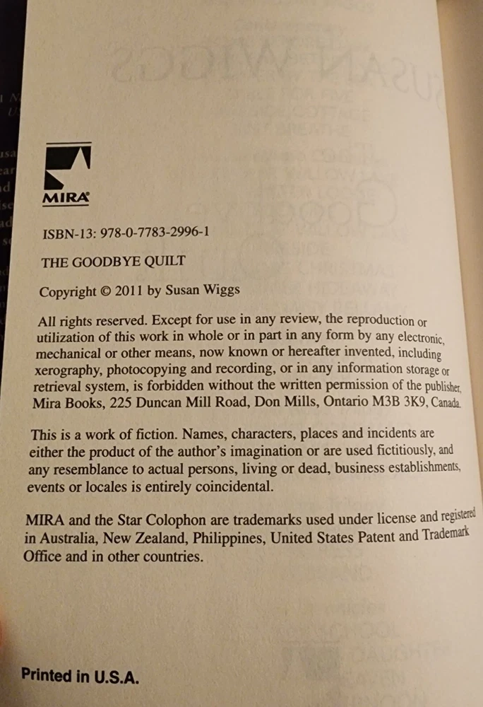 Susan Wiggs' "Goodbye Quilt" is a heartwarming contemporary romance novel published by Harlequin Enterprises Ulc in 2011. The hardcover book measures 7.5 inches in length, 5.5 inches in width, and 1 inch in height, with a weight of 10.6 ounces. The novel tells the story of a woman who inherits her grandfather's quilt, only to discover a deeper family mystery. With 256 pages, this book is perfect for anyone who loves contemporary women's fiction, family life, and romance. Written in English, it is a must-read for anyone who enjoys reading about complex family histories and unexpected romantic feelings.