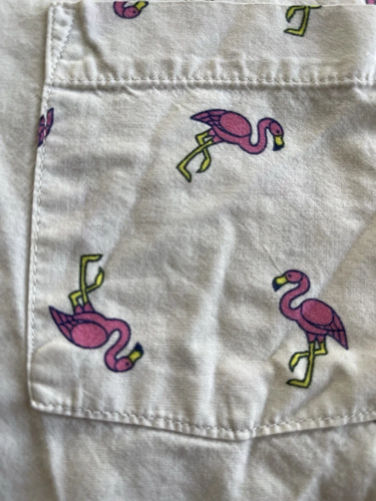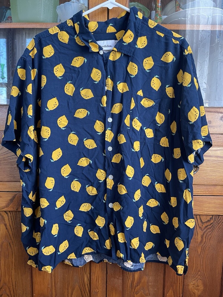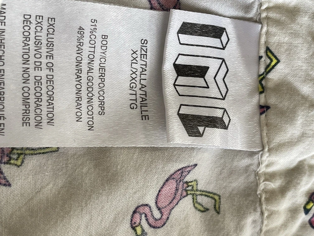 Different brands but measure same, 27 long armpit to armpit and 28 inches long. The first is a navy yellow lemon print shirt Goodfellow xxl. The second is an Isaac Morrison Limited, IML, pink and white(cream) flamingo print shirt, XXL Both excellent condition.