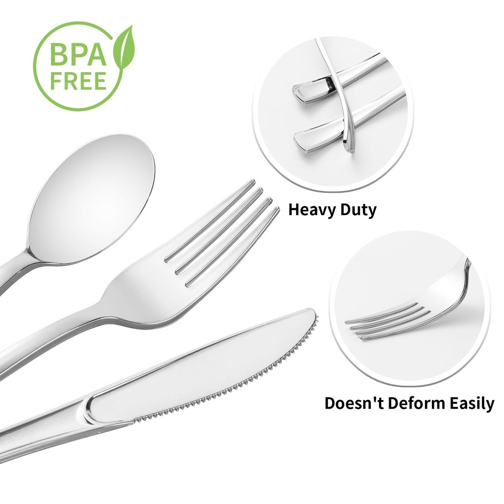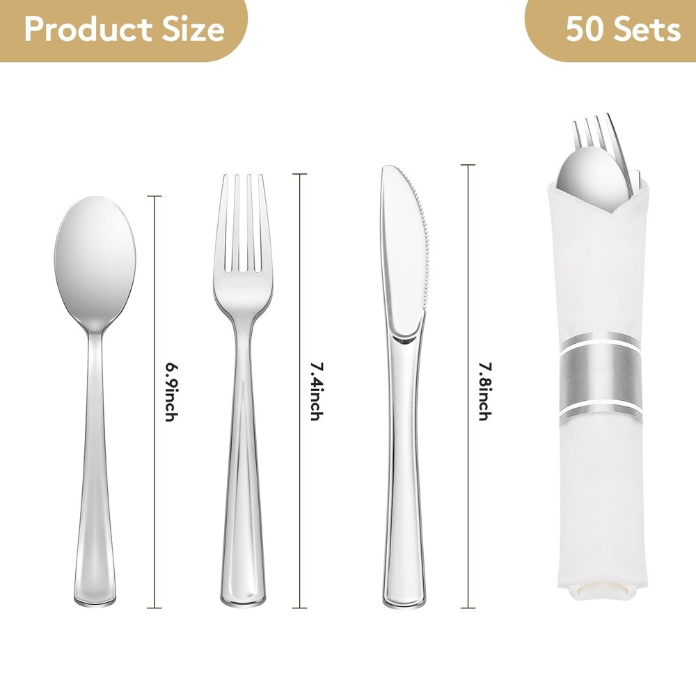 Goodluck 50 Pack Pre Rolled Silver Plastic Silverware, Wrapped Plastic Cutlery Set with Napkin Include 50 Forks, 50 Knives, 50 Spoons and 50 Napkins, Fancy Disposable Silverware for Party, Wedding Product Details Color: Silver Brand: Goodluck MPN: YS50PC UPC: Does not apply EAN: Does not apply Material: Plastic Color: Silver Brand: Goodluck Handle Material: Plastic Finish Type: Polished Material: Plastic Color: Silver Brand: Goodluck Handle Material: Plastic Finish Type: Polished Is Dishwasher Safe: No Manufacturer: Goodluck Product Dimensions: 6 x 8 x 14 inches Item Weight: 3.12 pounds Country of Origin: China Date First Available: May 3, 2023 Pre-rolled Convenience - As the perfect disposable utensils, you don't even have to worry about buying napkins. Our silver silverware set, paired with these pre-rolled napkins, makes your event a breeze. Safe Disposable Silverware Set - This silver plastic cutlery is 100% food-grade, made from BPA-free and heavy-duty plastic, ensuring minimal cracks and breakage during transportation and use. Elegant Silverware - These wrapped plastic cutlery sets go above and beyond any plain white or transparent plastic cutlery sets. With crisp white napkins and exquisite silverware, your parties are elevated with elegance and luxury. Perfect for Any Occasion - Whether it's birthdays, kids' parties, banquets, weddings, or various holidays like Valentine's Day, St. Patrick's Day, Easter, graduation season, Mother's Day, Father's Day, Halloween, Thanksgiving, Christmas, you name it, our rolled silverware disposable is ready to impress. WHAT YOU GET - A convenient 50-pack that includes 50 forks, 50 spoons, 50 knives and 50 napkins. Our disposable pre-rolled silverware ensures a hassle-free post-party experience, freeing you to savor moments with family and friends instead of worrying about cleanup.