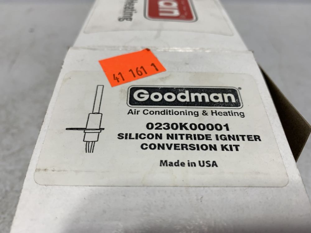PRODUCT DESCRIPTION Goodman 0230K00001 Igniter Kit 120V Silicon Nitride This is a New Goodman 0230K00001 Igniter Kit 120V Silicon Nitride (kit). It is designed for use in Goodman and Amana heating systems. Product Details: - Brand: Goodman - Manufacturer Part #: 0230K00001 - Condition: Brand new, unused, and in original packaging. - Voltage: 120 V - Durable construction for long-lasting performance Shipping: Will ship USPS Ground Advantage - Free Shipping. Expedited shipping options available at checkout. Find one of our products cheaper elsewhere? We will beat the price. Feel free to make an offer. © Copyright Chase Surplus, Inc. All rights reserved.