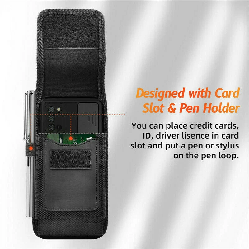 Features: * Brand New Metal Belt Clip , Belt Loop Pouch Nylon Velcro Flap Case * Materials : Canvas Nylon * Canvas exterior with Velcro closing flap; inside lined with cloth. * The interior is lined with black soft neoprene fabric that protects your phone from minor bumps and shock. * Premium leatherette and high-quality construction with black color stitching and sealed seams for durability and classic good looks. * Vents on the back for phones with rear speakers. Magnetic closing flap keeps your phone safely inside the case. * Holster case with belt loop, fixed metal belt clip and carabiner hook; 4 Different Ways to wear: Vertical/ Horizontal/ Clip On/ climbing hook. Elastic-type wide band to hold a pen or stylus on the case Package Included: 1 x Canvas Nylon Pouch Carrying Holster Case & Belt Clip Contact: If you are not satisfied with your purchase, simply contact us via eBay message and your interests will be protected. Please don't open a dispute or leave neutral/negative feedback without communication,I will reply within 12 hours of receiving the message.Thanks.