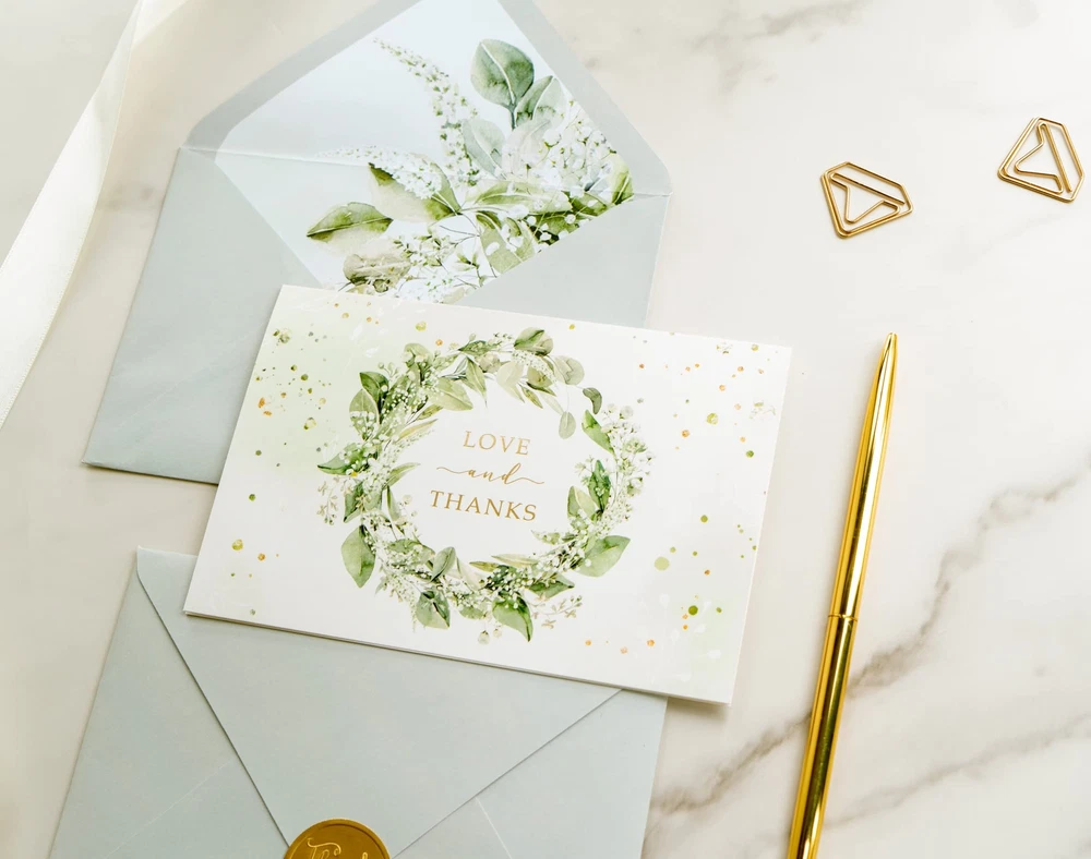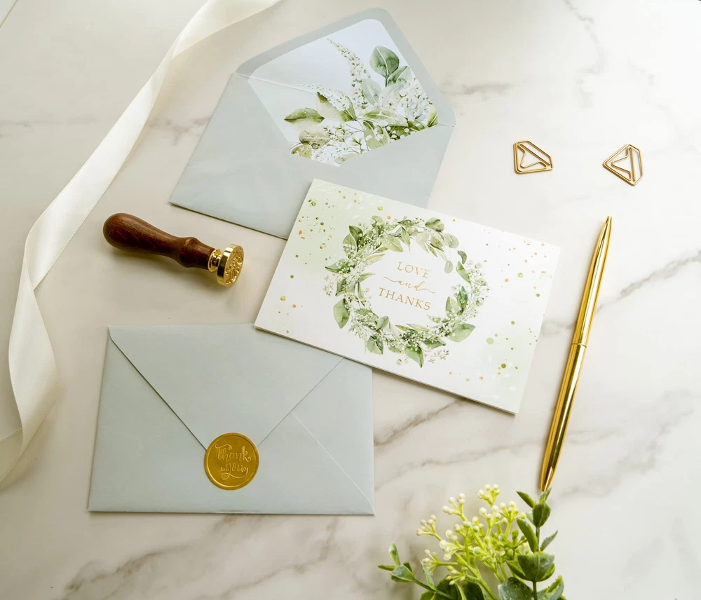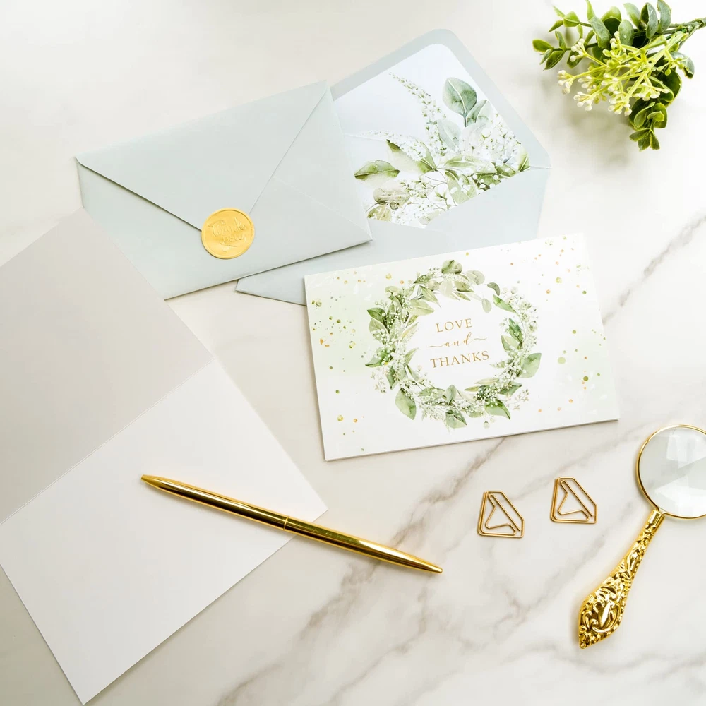 Say "thank you" in style with Gooji's top-ranked bulk green thank you cards gold, perfect for all events and occasions, big or small! The bright and vibrant graphics of greenery and botanical floral design make Gooji's elegant thank you notes a standout choice among other Greeting Cards. These high-quality contemporary thank you cards are made with 300 gsm premium cardstock, ensuring your message arrives intact, while also adding a sense of importance to your expression of gratitude. Impress your recipients with the matching printed envelopes, featuring a beautiful printed design inside, adding a touch of polish and sophistication to your Thank You Notes. Whether you need thank-you cards for weddings, businesses, or just everyday use, Gooji's wedding thank you notes with envelopes are a must-have for anyone who appreciates the art of gratitude.
