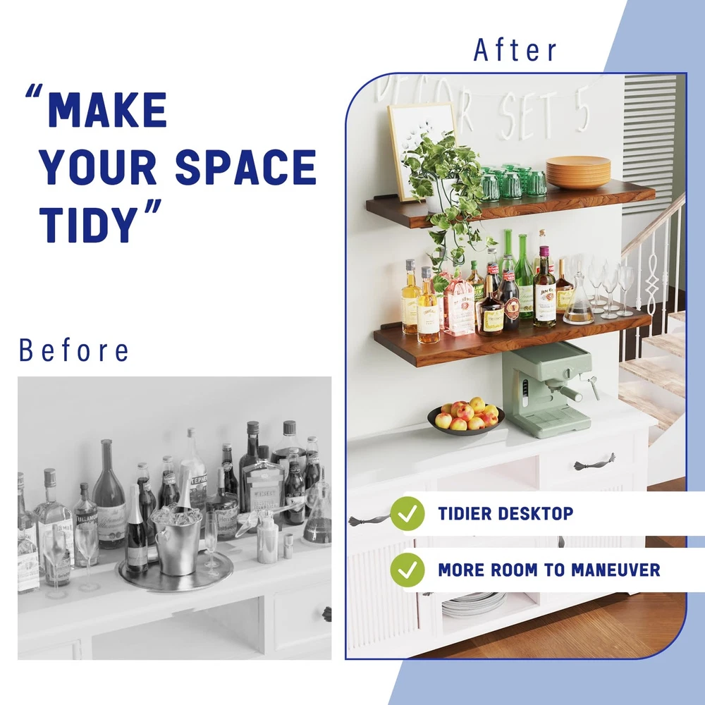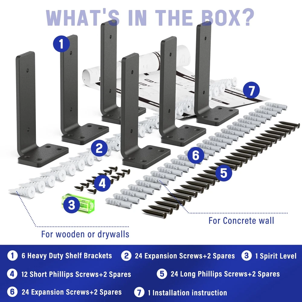 Goovilla Floating Shelf Bracket, Heavy Duty Shelf Brackets 6 inch, 6 PCS L Black Brackets for Shelves with Screws, Metal Wall Shelf Mounting Brackets Faced with a cluttered kitchen countertop, no room to place items and want to make a storage transformation? Putting things on walls is definitely a good way to solve your troubles. What 's changed after you use our L shaped shelf brackets ? 1.For kitchen, condiments, plates, pots, pans, glasses, wine, etc. you can leave more maneuverable space without piling them on the countertop. 2.For living room, the projector has a perfect stand, no need to buy additional stands and leave room for the decorations you bought to show your friends. 3.For bedroom, put the handcrafts you bought, put pictures of your family, and don't pile them on the nightstand. 4.For washroom, utilize the space on the narrow toilet bowl for large packs of paper towels and organize hoarded toiletries without taking up other space. 5.For laundry room, organize detergent, laundry detergent, and other cleaning supplies without taking over the folding. 6.For terraces, increase the use of balcony space by putting greenery from the floor on the wall. 7.For storeroom, putting the storage baskets on the wall. Unrestricted features!!! 1.First is not limited to 2 brackets short boards mounted in a row. Long boards, corners mounted, etc. can be made according to the actual situation. 2.Second is not limited to individual size combinations combine and match each size for a richer mix. 3.Third is not limited to only 6 brackets, if you are using a large space, 12 or more brackets are needed. What’s in the package? 6*Shelf Brackets 12*Short Phillips screw+2 for spare 24*Long Phillips screw+2 for spare 24*Expansion screw for concrete wall+2 for spare 24*Expansion screw for Wooden or drywalls+2 for spare 1*Spirit Level 1*Installation instruction 【Standard 90° bending】In order to ensure that each shelf bracket can be at 90° to the maximum extent possible, we add a rigorous picking process before the shelf brackets are packaged. The standardized 90-degree design is so important that it’ s the objective factor in ensuring that items remain level and do not tip over after being placed on the board(board is not included). 【Heavy Duty Iron & Durable Coating】Our floating shelf hardware is made of thick, heavy-duty iron, stamped and bent in one piece, no welds are not easy to break with better toughness. Each pair of floating shelf bracket can hold up to 160 pounds of weight. The surface is covered with a thick layer of black frosted coating. It increases the friction between the board and the bracket, on the other hand, it is more waterproof and less prone to rust, which prolongs its service life. 【Complete Accessories & Easy to Install】Boards is no included. Provide all the screws needed for different wall mountings, and extra spare screws are prepared for unexpected situation. They can achieve strong grip on wall surface. And a spirit level is also included to measure as well as keep the shelf hardware balanced during installation. Detailed installation instructions are provided. Just follow the steps, this wall mount shelf bracket can be installed even by someone without experience. 【For Wood&Plaster&Concrete Wall】No need to worry about you can’t use our heavy duty shelf brackets on the wall you want to. These black shelf brackets can be used on wooden wall, drywall and hard concrete wall. The screws used for wooden wall and plaster walls are the same and are explained in detail in the instructions. 【Unrestricted Space Usage】We provided 6in, 8in, 10inch and 12inch brackets for floating shelves. Pick the right bracket or use it in combination depending on the actual space or the size of the planks. Hanging shelf bracket is not limited to kitchen use only, is also for living rooms, bedrooms, bathrooms, storage rooms, utility rooms, checkrooms, laundry room and corners to store green plants, photo frames, handwork, books, toiletries, storage baskets, sundries or to be a cat climbing frame.