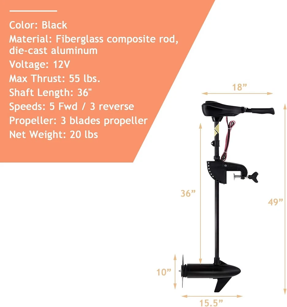 Goplus Electric Trolling Motor 8 Speed, Boat Fishing Motor w/Telescoping Handle, Two-bladed Propeller, LED Battery Indicator and 36" Shaft for Freshwater Saltwater Use Item Description About this item 【Powerful & Quiet Trolling Motor】The 46/55/86LBS pound thrust to this electric trolling motor gives you a lot of power to push the boat with strong force to generate a wake off and on for several hours before requiring a charge. And even at the full speed, the motor can run very quietly. 【Forward & Reverse Speed Adjustments】The 8 speed control system (5 forward speeds and 3 reverse speeds) allows you to fully control the motor through the dial on the ergonomic telescopic handle, so as to achieve a smooth, highly adjustable ride. The reverse speed will let you get rid of any jams! 【Sturdy Built for Salty or Fresh Water Use】Made of glass fiber composite rods, durable die-cast aluminum heads and reinforced composite materials, it can resist bending, warping and damage, and is very suitable for use in fresh water and salt water. When trapped in heavy weeds, it will trip the fuse before it blows to prevent burning the motor. 【Adjustable Shaft for Easy Maneuver】The adjustable shaft allows for proper depth placement in different water conditions. Together with the mounting bracket tilt mechanism, you can set it to desired height and angle to comfortably steer by sitting or standing, so that you don’t have to bend over from your pedestal seat to operate it. 【Portable Design with LED Battery Indicator】The transom mount trolling boat motor is powerful and easy to operate. The battery light on this motor is also a big advantage in helping you know when it's either time to go in and recharge, or take out a second battery. › See more product details You can plug or press the knob to adjust the shaft angle to meet your surfing deamnd. And you can freely reset the normal position to slow down. You can adjust the depth of propeller by moving the position of the clamp to speed up or decelerate and meet your different moving needs. The handle is telescoping to be longer or shorter according to your various needs and likes. And you can move foward or reverse by adjusting the knob. You can lossen the 2 fixing screws to adjust the positions to meet your different moving demands. And the thread screws are not easy to drop down while the calmp is steady and durable. The light LED lights inform you that how much power is left timely, helping you protect the batteries and lasting for long service time. The solid fixed ring is also adjustable according to the position of the boat clamp, avoiding the clamps moving up and keep it stable with security. Payment We accept payment only through PAYPAL Shipping We ship products worldwide through standard express courier service, it will reach within 7 to 10 days to abroad buyers, we ship the product after recieved clear payment and give full information about shipment to the buyer Return We accept product return within 7 to 21 days from delivery date but product should be in original position and not in damaged condition,the return shipping charges will be buyer responsibility