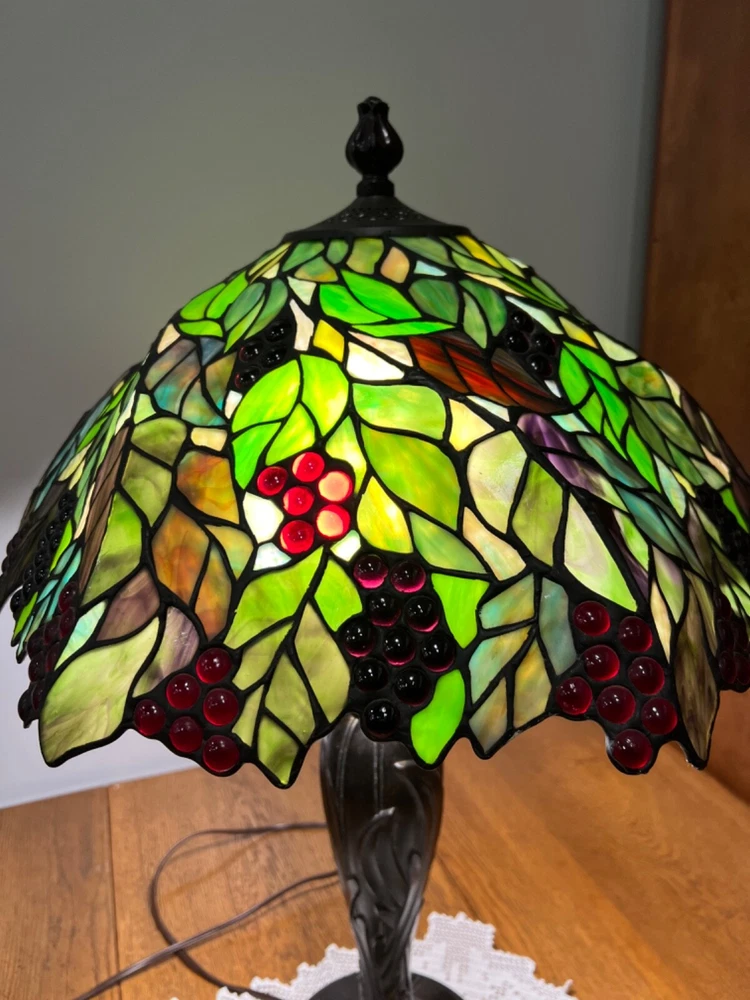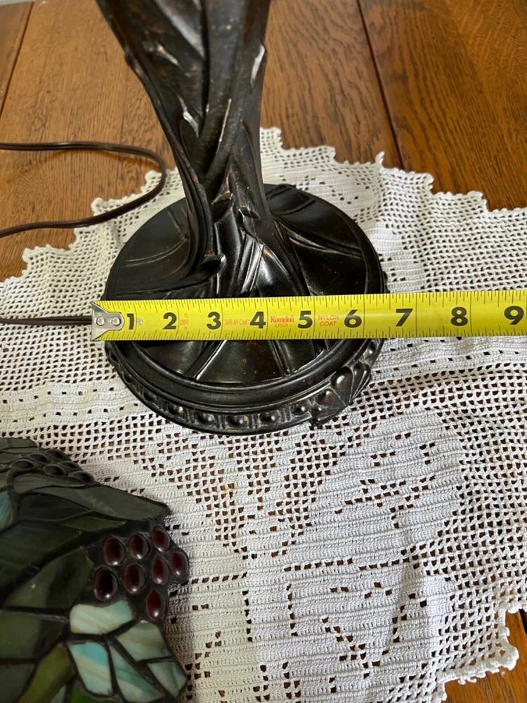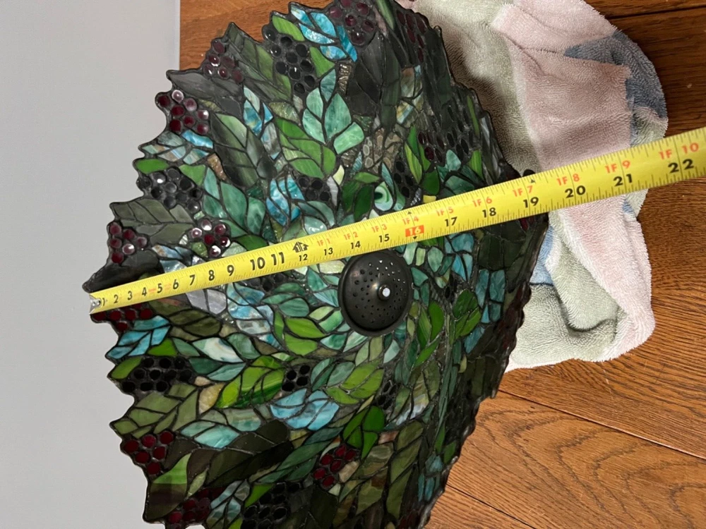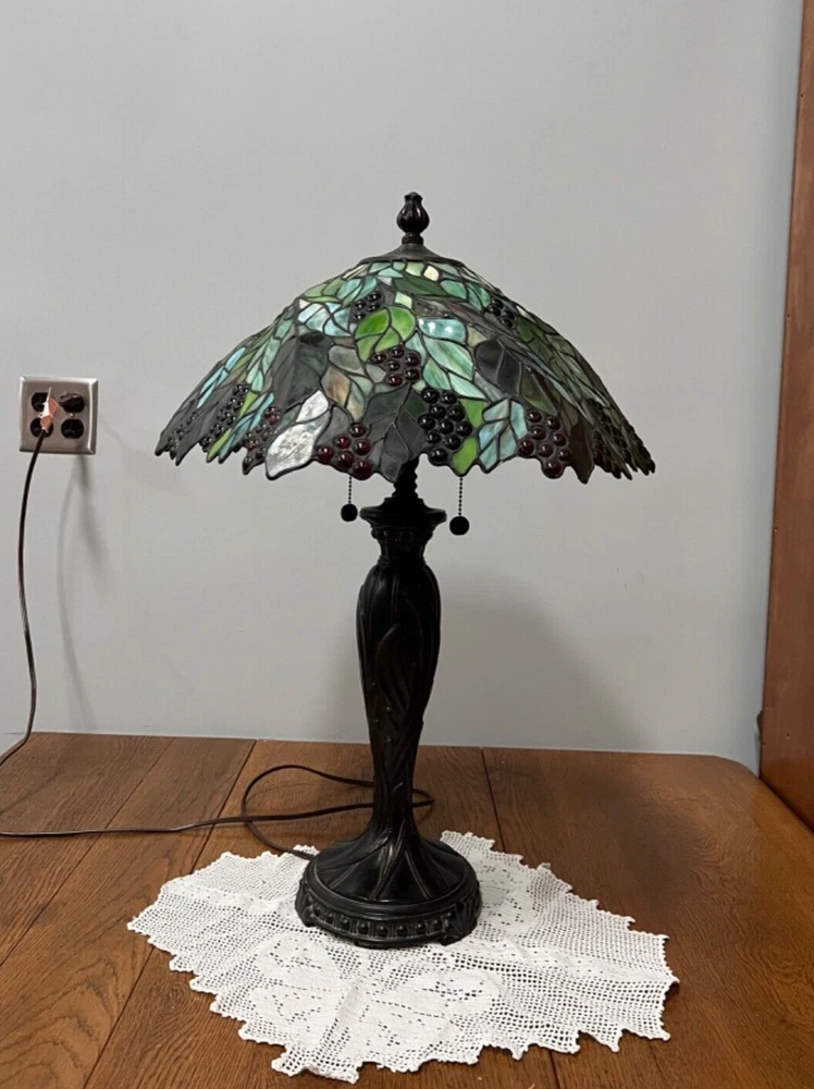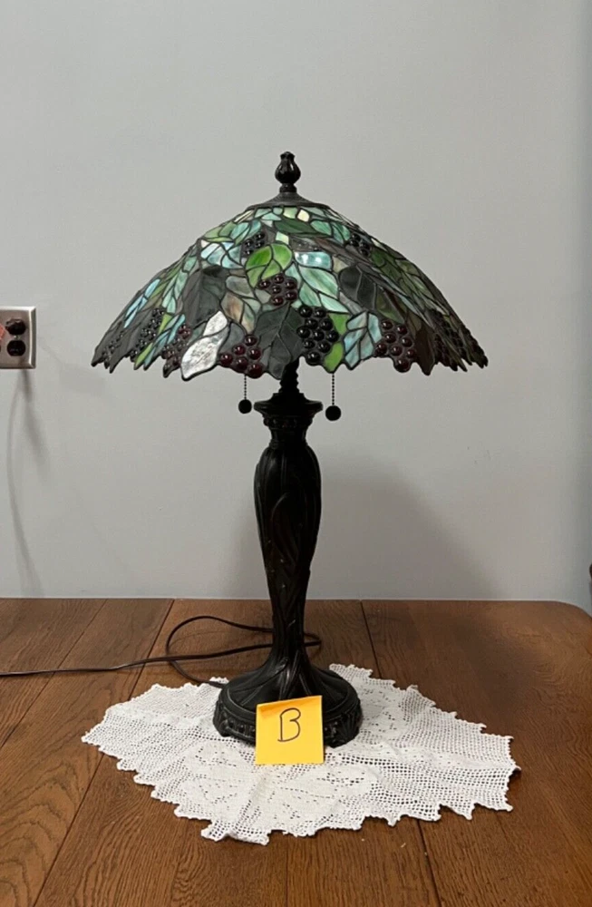 Gorgeous Dale Tiffany Stain Glass Lamp, Grape Vine Shade With Over 100 Jewels- #B Beautiful Lamp, The Pictures Don't Do It Justice. Excellent Working Condition, Very Heavy. There Is Some Chipping Of The Bronze Finish Up Where The Chain Ball Rubbed On The Lamp-See Last Photo Measures Approx 28"H Shade Approx 19"W x 10"D Bulbs not included We have 2 of these lamps - check out of other listings if interested in both Please see photos for details and condition ***Most items ship within 2-3 business days*** **** I ONLY SHIP WITHIN THE LOWER 48 OF UNITED STATES **** Please note: Shipping charge posted to this listing is based on shipping within the lower 48 of United States – if you live outside of the continental US and are interested in one of my items, please message me prior to purchasing the item so that I can provide you with accurate shipping charges. The only exception would be if you qualify for eBay’s international shipping that first processes through a domestic hub. Failure to do so could result in your purchase being cancelled.
