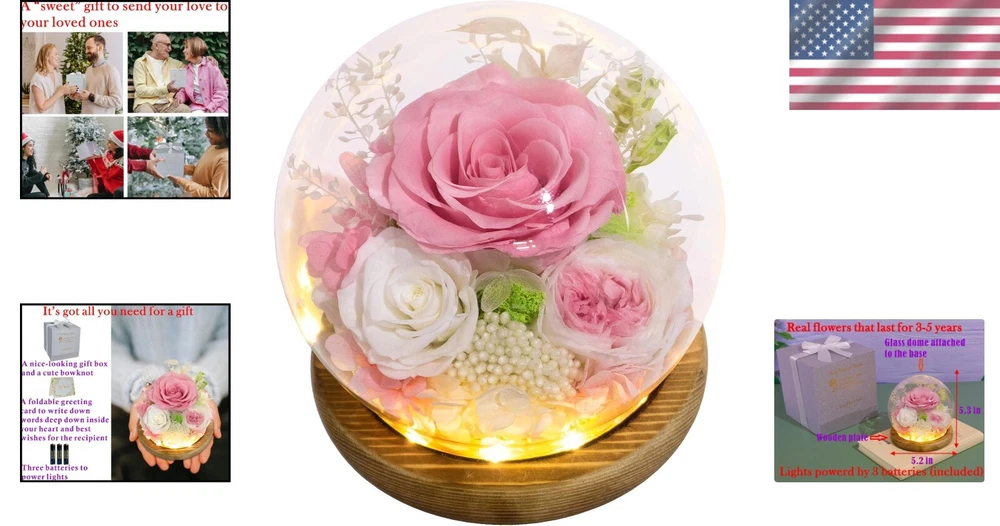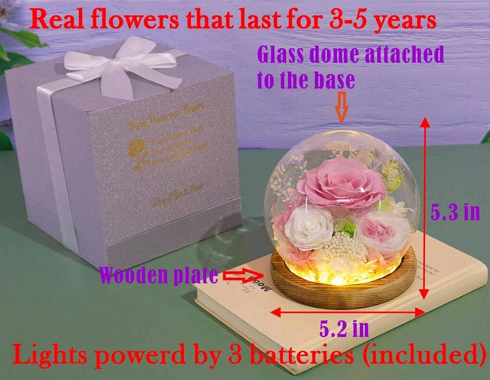 Gorgeous Dome of Preserved Roses - Romantic Gift for Valentine's, Anniversaries ‹ › ‹ › ‹ › ‹ › ‹ › ‹ › ‹ › ‹ › Gorgeous Dome of Preserved Roses Romantic Gift for Valentine's, Anniversaries Features: 100% Real Flowers: Handpicked at their prime, these flowers are preserved to maintain their natural beauty, lasting 3-5 years without the need for watering or maintenance. Symbol of Love: Perfectly symbolizes affection and sentiment, making it an ideal gift choice for that special someone. Thoughtful Packaging: Arrives in a stunning gift box that includes lights powered by three batteries, enhancing the visual allure of the flowers. Personal Touch: Comes with a greeting card allowing you to express your heartfelt messages and best wishes. Positive Ambiance: Enhances any space, uplifting mood and creativity through its natural elegance. Handcrafted Quality: Each flower is meticulously crafted and inspected to ensure you receive flawless quality. Benefits: Long-lasting beauty of real flowers without daily upkeep. Create cherished memories that remind your loved one of your affection. Enhance home decor with delightful and natural aesthetics. Express deep feelings and appreciation with a personal note. Why Choose Our Dome of Preserved Roses? Looking for the perfect gift that speaks volumes of your love? Our Gorgeous Dome of Preserved Roses is more than just a decorative piece; it is a heartfelt gesture that lasts. It captivates not only through its exquisite beauty but also provides a lasting token of affection that reminds your loved one of your devotion, growing deeper over the years. Let your love shine through this enchanting gift. Order now and elevate your romantic gestures! Please Note: Opening the glass dome is not recommended to preserve the integrity of the flowers. As each flower is handmade, there may be slight variations enhancing its uniqueness. If the lights do not work, please check the battery insertion for proper alignment. Shipping Free & Fast Shipping - We offer free shipping to most of the USA with a normal delivery time of 3-7 days. However, due to the current situation, additional delivery time (up to 3 weeks) may be required for some items. Alternative Carriers - We may use alternative carriers (e.g. USPS, FedEx, UPS, etc.) to ensure your package arrives safely and on time. Due to the use of multiple carriers, we are unable to provide a tracking number automatically. Handling Time - Orders are processed and shipped within 1-2 business days of receiving cleared payment. Shipping Restrictions - Shipping to Alaska, Hawaii, Puerto Rico, Guam, and other US territories may incur shipping charges or delivery restrictions. Please contact us before ordering, or your order can be refunded/cancelled. State Restrictions - There may be restrictions based on your state of purchase. For example, certain items may not be shipped to California due to state regulations. Contact for Tracking Updates - If you require tracking updates or have any concerns about the delivery of your order, please feel free to contact us, and we will be happy to assist you. Return 30-Day Hassle-Free Returns - We want you to be completely satisfied with your purchase. If you are not, you can return the item within 30 days of receiving it for a full refund or exchange. Easy Return Process - To start a return, simply contact us and we will provide you with a prepaid return shipping label and detailed instructions. Restocking Fee - There are no restocking fees for returns. However, the buyer is responsible for return shipping costs if the return is not due to a seller's error. Refund Processing Time - Refunds will be processed within 5 business days of receiving the returned item in its original condition. Payment We accept all major credit cards, PayPal, and Apple Pay for your convenience. Your payment information is secure and encrypted to ensure a safe and seamless transaction. Please complete your payment within 3 days of purchase to avoid any delays in shipping. Feedback Your feedback is extremely important to us. We strive to provide the best products and customer service possible. If you are satisfied with your purchase, please take a moment to leave us a positive review. If you have any concerns or issues with your order, please contact us before leaving negative feedback. We are committed to resolving any problems and ensuring your satisfaction. Contact Us If you have any questions or concerns, please feel free to reach out to our customer support team. You can contact us through the eBay messaging system. We are available Monday to Friday, 9:00 am to 5:00 pm EST, and we will do our best to respond to your inquiry within 24 hours. Buy it now and enjoy a pleasant shopping experience! UPC: Not Set Item Width: Not Set Unit Quantity: 0.7 Material: Glass,Mixed Materials,Wood,Fresh Flowers Common Name: Rose,Pink Rose,White Rose,White Pink Austin Rose Brand: Unbranded Product: Real Flower Gifts Type: Flower Arrangement Artificial/Fresh: Fresh Form: Arranged Color: Pink Rose Occasion: All Occasions MPN: Not Set Theme: Romantic Size: 5.2 in Country/Region of Manufacture: Not Set Item Height: Not Set Number in Pack: 1 Unit Type: lb Personalize: Not Set Personalized: Not Set