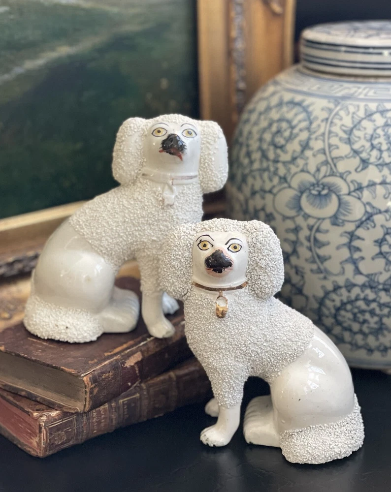 Magnificent Rare 19C White English Staffordshire Figural Spaniel Mantle Dog Pair • Textural Coats • Rare Style with Separate Legs • Heavy Period Model • Embossed Mark to Bases 2 1/2 • Gallery Quality • Height 5.6” This is a stunning pair of extremely scarce gallery quality 19C English Staffordshire mantle dogs featuring textural coats in classic form and rarely found in this petite but rarely seen robust scale. Beautifully modelled with intact separate front legs and highly desirable for their timeless style, this superb surviving period pair of right and left facing figures will bring a touch of the English countryside to any setting in which it is placed when paired on its own or featured as part of a collection or arrangement. Excellent rare period examples to own and treasure. Condition of this superior find is excellent with minimal expected age related wear only. Superbly aged patina on these pristine display ready figures. No post production chips or cracks. Extremely high quality pair. * Listing is for white textural mantle dog pair only. Other objects are for display purposes. Height 5.6” Length 4.6” Width 3.25”