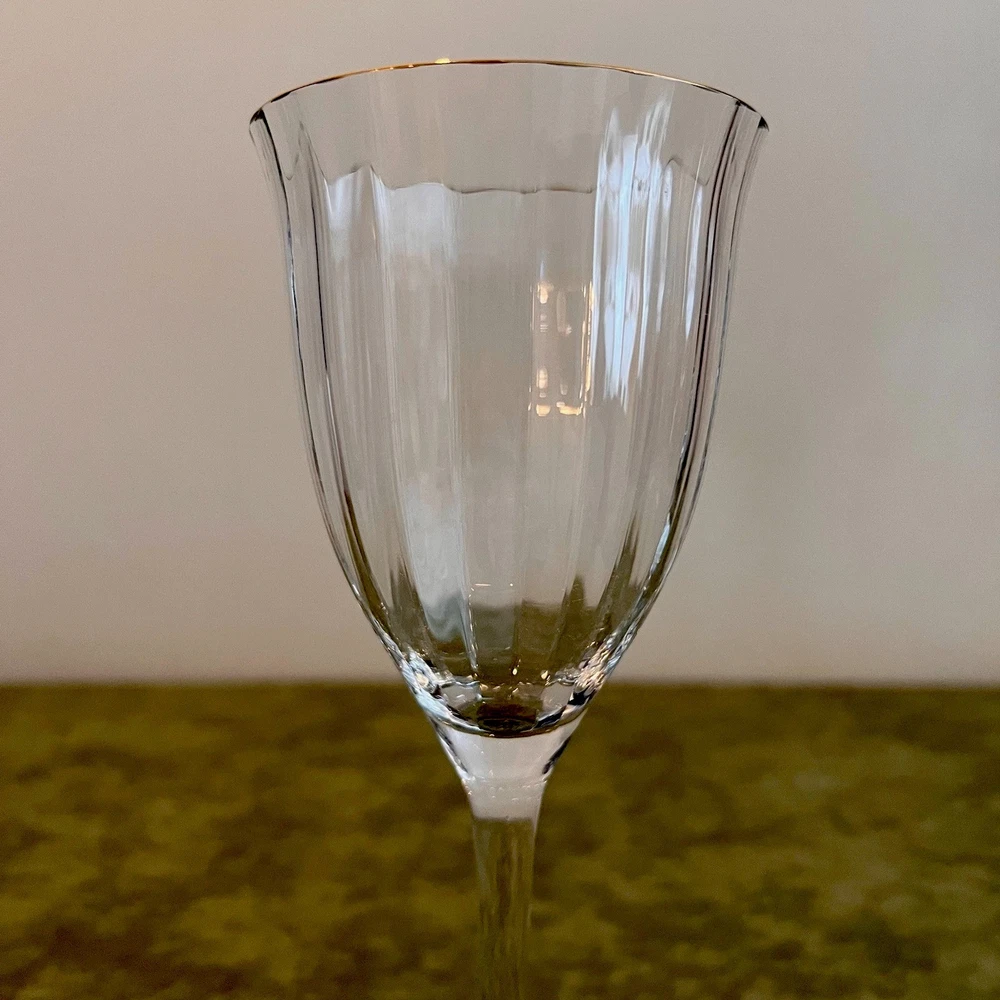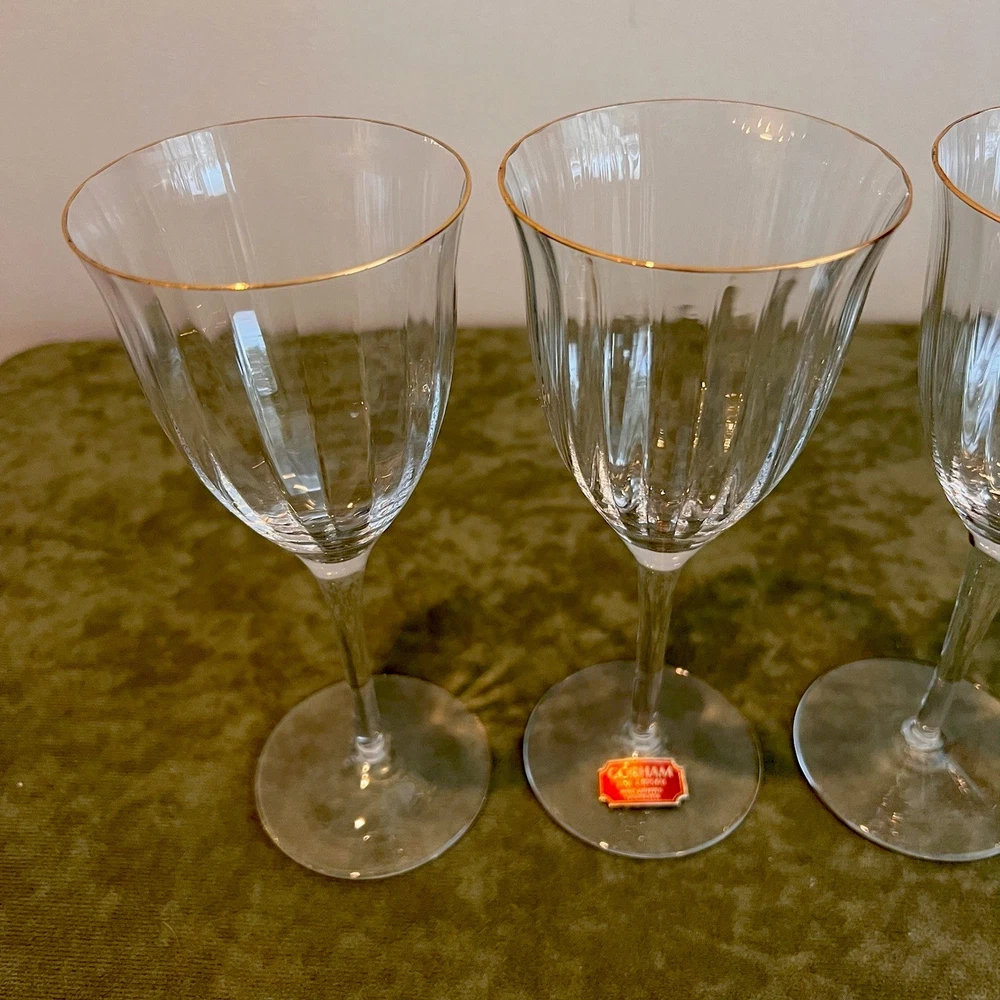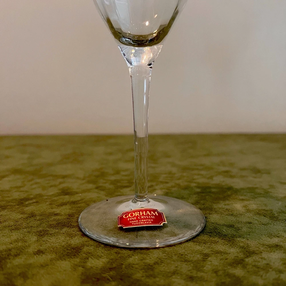 This vintage set of four Gorham Laurin crystal wine glasses is elegantly designed with a gold rim and ribbed backstamp. Handmade in Yugoslavia in 1982, each round wine glass stands at 7 1/4 inches tall with a 3-inch diameter. The contemporary style and glossy finish make them suitable for all occasions, while the "Laurin" pattern adds a touch of sophistication. Care instructions recommend hand washing only, and the glasses are crafted with high-quality crystal. Perfect for wine lovers, this set showcases a unique blend of elegance and craftsmanship from the 1980s.