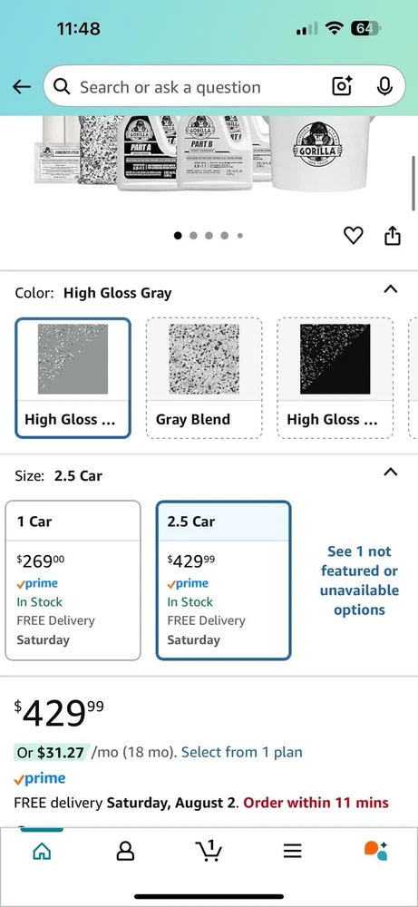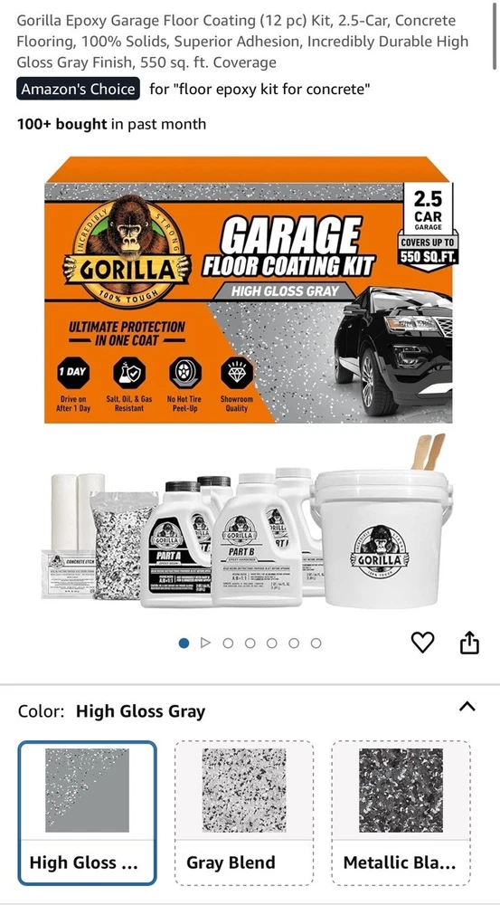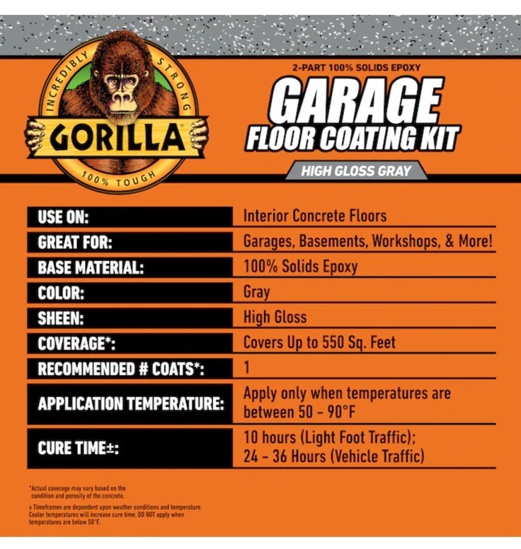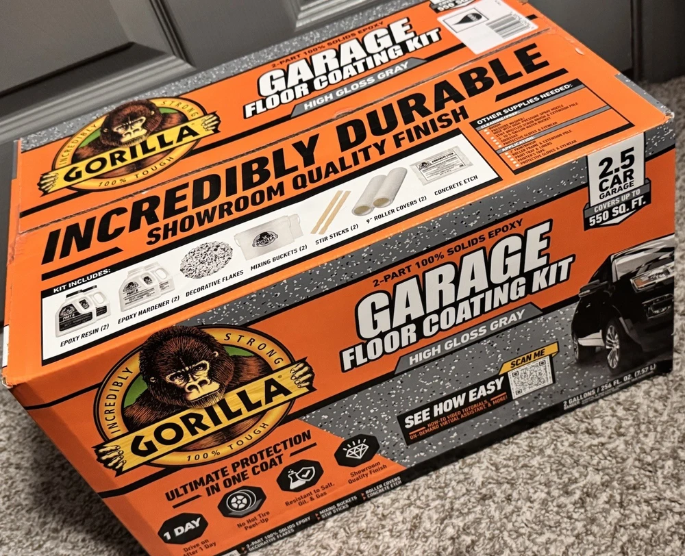 Gorilla Epoxy Garage Floor Coating (12 pc) Kit, 2.5-Car, Concrete Flooring, 100% Solids, Superior Adhesion, Incredibly Durable High Gloss Gray Finish, 550 sq. ft. Coverage This item is brand new and sealed. Originally $430 plus taxes.