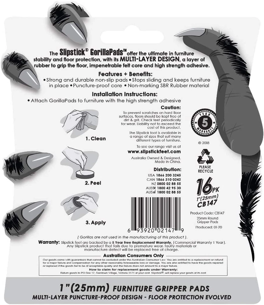 GorillaPads CB147 Non Slip Furniture Pads/Gripper Feet (Set of 16) ... MIGHTY GRIP THAT WONT SLIP – GorillaPad Furniture Grippers by Slipstick are the universal solution to stop unwanted movement or sliding of furniture / objects and effectively protect hard surfaces from scratches or damage IDEAL FLOOR PROTECTORS FOR FURNITURE FEET – Premium floor protecting rubber pads stop sliding and keep furniture or décor firmly in place – perfect for use under furniture, table legs, chairs, armchairs, ottomans, sectional couches, sofas, electronics and more SAFE ON ALL HARD FLOORS / SURFACES – These anti-skid floor guards protect all hard surfaces from scratches, marks or damage – Perfect floor protectors for hardwood floors, laminate, tile, LVT, marble, linoleum, concrete and more HEAVY DUTY SELF ADHESIVE TO STAY ON FURNITURE – Each round grip pad features a strong adhesive backing for quick and easy attachment under furniture – simply clean off the furniture foot, peel off the adhesive backing and stick on DURABLE PUNCTURE PROOF DESIGN – GorillaPads feature a specially formulated anti slip rubber base layer that provides maximum grip between furniture and floor and have a puncture proof solid felt core for durability (covered by 5 year free replacement ) GorillaPad furniture grippers by Slipstick are the universal solution to stop your furniture or décor from unwanted sliding and protect your floors and hard surfaces from damage. GorillaPads feature a highly durable rubber foam base layer that provides an unparalleled grip between the bottom of furniture and the floor surface and have a dark brown solid felt core to prevent furniture from puncturing through. Pads do not leave marks on floors or surfaces and are safe for use on all hard surfaces such as hardwood floors, counter tops, shelves, tile and more. Each pad features a self-adhesive backing for quick peel and stick attachment. Includes 16 black non-slip pads that are 1” in diameter. Perfect for use under any furniture piece or object such as a kitchen table and chairs, couch sectionals, armchairs, electronics, TVs, home decor, and anything you want to keep in place or protect from damaging the surface it rests on. Covered by Slipstick’s 5-year free replacement (1 year commercial). Item model number 22211400 Part Number 22211400 Batteries Required? No Size 1 Inch Round Color Black Product Dimensions 1 x 1 x 0.2 inches Material Rubber Country of Origin China Item Weight 0.634 ounces Manufacturer Slipstick Shape Round Batteries Included? No Surface Recommendation Tile,Hardwood,Laminate Special Features Durable,Premium Number Of Pieces 32 Brand Slipstick Included Components 16 x 1" Round Self-Stick GorillaPads ABOUT US We offer the best prices around on high quality products. Our Ebay store includes media such as books, movies, music and games while offering electronics, toys, sporting apparel, clothing, tools, general home, garden items and more. SHIPPING We are always working hard to ensure your package arrives as soon as possible. Please understand that some factors like weather, high postal traffic, and the performance of shipping companies are outside of our control. We offer free shipping to the lower 48 states and ship within 2 business days of payment, usually sooner. We do not accept P.O. Boxes. Please provide a physical address. RETURNS We offer a 30-Day Return Policy on items which you are not completely satisfied with. You have the option for a full refund or an exchange of the item. No returns are available on items shipped outside of the USA. CUSTOMER SATISFACTION We try our very best to make sure every customer is completely satisfied. If there's a problem, message us! We're happy to help.