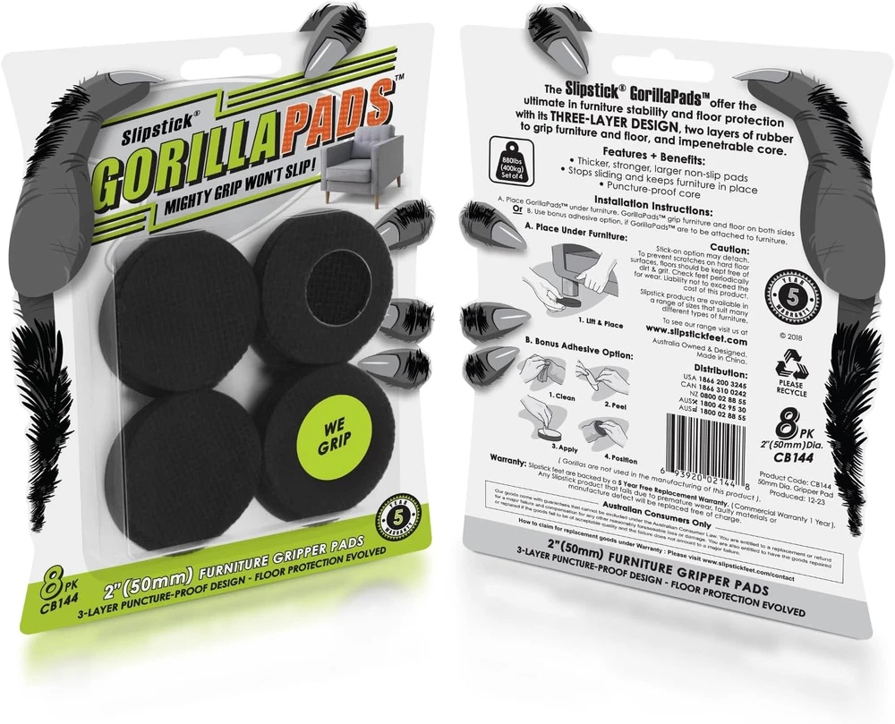 Gorillapads CB144 Non-Slip Furniture Pads/Grippers (Set of 8), 2 Inch Round, Black [[IMAGE]] Hello, We Do Sell Mobiles, Computers Tablets & Network Accessories! Features Mighty grip that won’t slip – GorillaPad furniture stoppers by Slipstick are the universal solution to stop furniture from sliding, prevent unwanted movement, and effectively protect all hard surfaces from damage. Includes 8 x 2 inch round non slip furniture pads. Ideal floor protectors for furniture feet – These premium non slip furniture pads are perfect for use under furniture feet, couch feet, sofa feet, table feet, sectionals, bed posts, dressers, appliances, fish tanks and any object you want to keep in place and protect the surface it rests on. Puncture proof 3 layer furniture pads – For maximum durability and gripping power, Gorillapads feature a puncture proof 1/5” thick solid felt pad core between specially formulated rubber foam outer layers that provide maximum traction. Premium furniture pads for a wide range of furniture and floors. Works on all hard floors / surfaces – These anti skid furniture pads protect all hard surfaces from scratches and damage. Great non slip floor protectors for hardwood floors, laminate, tile,LVT, LVP, glass, marble, linoleum, concrete and more. Self-stick option – Includes 8 round non-slip furniture pads that are 2 inches in diameter and 5/16” thick (compress to 1/8" thick under furniture); also includes 8 adhesive backings for optional self-stick attachment to furniture. Gorillapads can be used with or without the adhesive backings (not required). Slipstick GorillaPads CB144 Non Slip Furniture Pads/Grippers (Set of 8) Furniture Feet Floor Protectors, 2 Inch Round, Black Item model number 22211372 Unit Count 8.0 Count Number of Pieces 16 Number of Items 1 Color Black Special Feature Non-Slip Product Dimensions 2"L x 2"W x 0.31"Th Material Polypropylene (PP) Country of Origin China Grip Material Rubber Item Weight 1.76 ounces Department Unisex-Adult Shape Round Recommended Uses For Product Grip Surface Recommendation Tile,Hardwood,Laminate Is Discontinued By Manufacturer No Size 2" Round 2.0 "th x 2.0 "th x 0.31 "th. Weight: 1.76 oz Payment We accept all payments via Ebay using Credit Cards , PAYPAL , Apple Pay and many others Shipping We are always working hard to ensure your package arrives as soon as possible. Please understand that some factors like weather, high postal traffic, and the performance of shipping companies are outside of our control. Delivery & Return Policy We offer a 30-Day Return Policy on items in which you are not completely satisfied with. You have the option of a full-refund or an exchange of the item. No returns are available on items shipped outside of the USA.