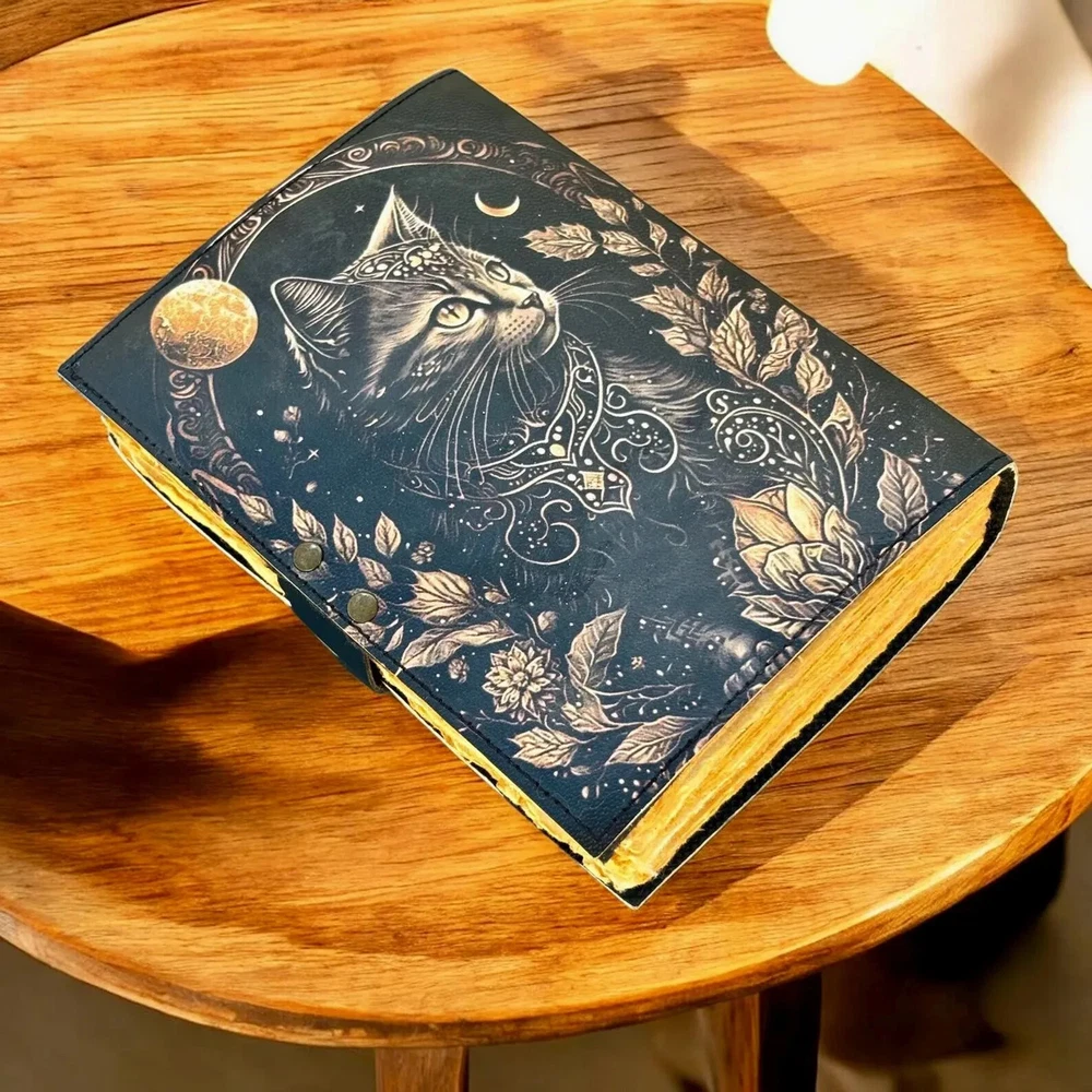This Leather Journal Gothic Notebook CAT Grimoire Print is a vintage handmade journal with a luxurious and limited edition feel. The journal features a leather cover with unique gothic cat grimoire print, and it is personalized to make it truly special. Handmade in India, this journal is perfect for those who appreciate artisanal and vintage items, making it a unique and special addition to any office or workspace. Cat Journal Notebook by THE UDAIPUR ART Embrace the timeless elegance of The Cat Leather Journal Notebook by THE UDAIPUR ART , a perfect blend of classic craftsmanship and modern functionality. Handcrafted with meticulous attention to detail, this journal features high-quality leather that not only adds a touch of sophistication but also ensures durability for years to come. Key Features: The Phoenix Leather Journal Gothic Notebook - Vintage Handmade Book of Shadows with Name, Personalized Gifts for Men, Dark Academia Gift, Handmade Paper: Each page of The CAT Leather Journal Notebook by THE UDAIPUR ART is made from premium handmade paper, providing a unique texture and a high-quality writing experience. Perfect for writing, sketching, or jotting down your thoughts and ideas. Available in All Sizes: 7x5 inches 8x6 inches 10x7 inches 13x10 inches Whether you need a compact notebook for on-the-go notes or a larger journal for detailed entries and sketches, The Phoenix Leather Journal Notebook by THE UDAIPUR ART is available in all sizes to suit your needs. Secure Brass C-Lock: The journal is equipped with a vintage brass C-lock, ensuring that your thoughts, ideas, and sketches remain secure and private. The elegant lock not only adds a layer of protection but also enhances the overall aesthetic of the journal. Ideal for writers, artists, students, or anyone who appreciates fine craftsmanship, The Phoenix Leather Journal Notebook by THE UDAIPUR ART is more than just a place to write—it's a companion that inspires creativity and captures memories.