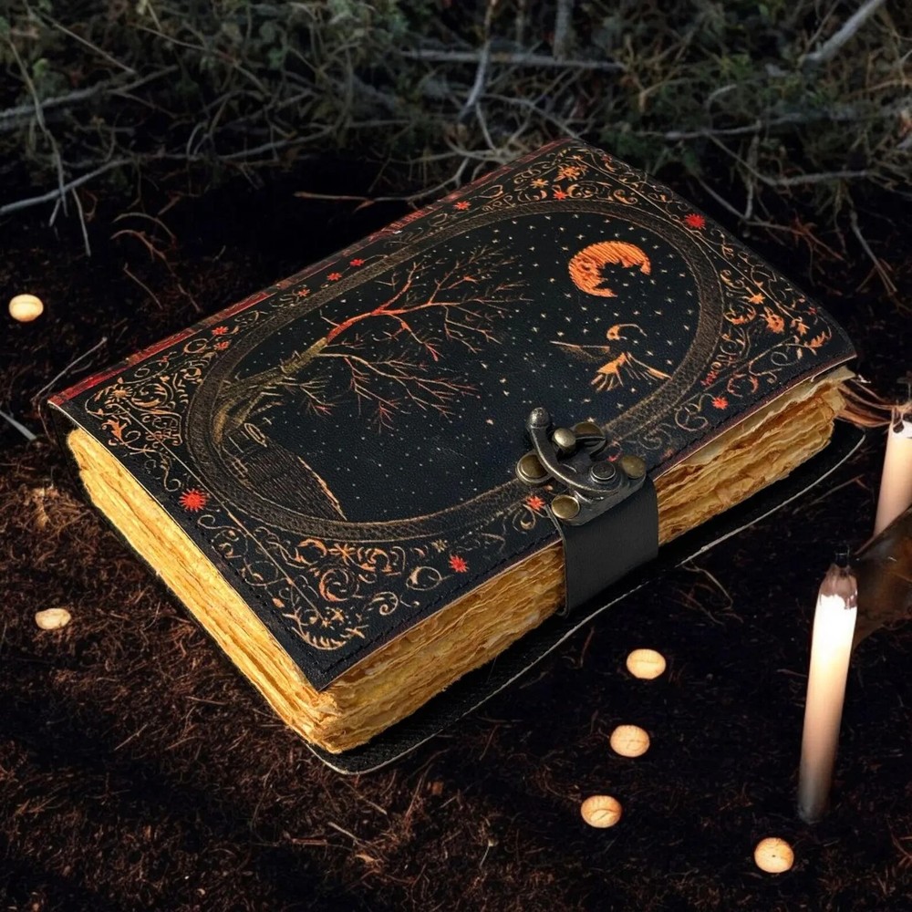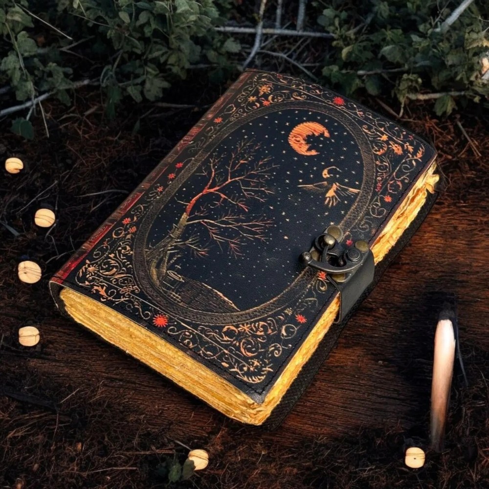 This Leather Journal Gothic Notebook Snake Grimoire Print is a luxurious and limited edition handmade journal crafted in India. The exquisite leather cover features a gothic snake grimoire print, adding a touch of vintage charm to this unique notebook. Personalized and 1st edition, this journal is perfect for those looking for a special and distinctive place to jot down their thoughts and ideas. With its high-quality materials and intricate design, this journal is sure to stand out in any collection. The Tree of Life Leather Journal Notebook by KHAFRA HANDMADE Embrace the timeless elegance of The Tree of Life Leather Journal Notebook by KHAFRA HANDMADE, a perfect blend of classic craftsmanship and modern functionality. Handcrafted with meticulous attention to detail, this journal features high-quality leather that not only adds a touch of sophistication but also ensures durability for years to come. Key Features: The Tree of Life Leather Journal Gothic Notebook - Vintage Handmade Book of Shadows with Name, Personalized Gifts for Men, Dark Academia Gift, Handmade Paper: Each page of The Tree of Life Leather Journal Notebook by KHAFRA HANDMADE is made from premium handmade paper, providing a unique texture and a high-quality writing experience. Perfect for writing, sketching, or jotting down your thoughts and ideas. Available in All Sizes: 7x5 inches 8x6 inches 10x7 inches 13x10 inches Whether you need a compact notebook for on-the-go notes or a larger journal for detailed entries and sketches, The Tree of Life Leather Journal Notebook by KHAFRA HANDMADE is available in all sizes to suit your needs. Secure Brass C-Lock: The journal is equipped with a vintage brass C-lock, ensuring that your thoughts, ideas, and sketches remain secure and private. The elegant lock not only adds a layer of protection but also enhances the overall aesthetic of the journal. Ideal for writers, artists, students, or anyone who appreciates fine craftsmanship, The Tree of Life Leather Journal Notebook by KHAFRA HANDMADE is more than just a place to write—it's a companion that inspires creativity and captures memories.