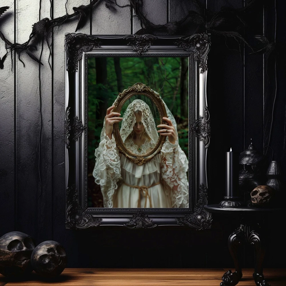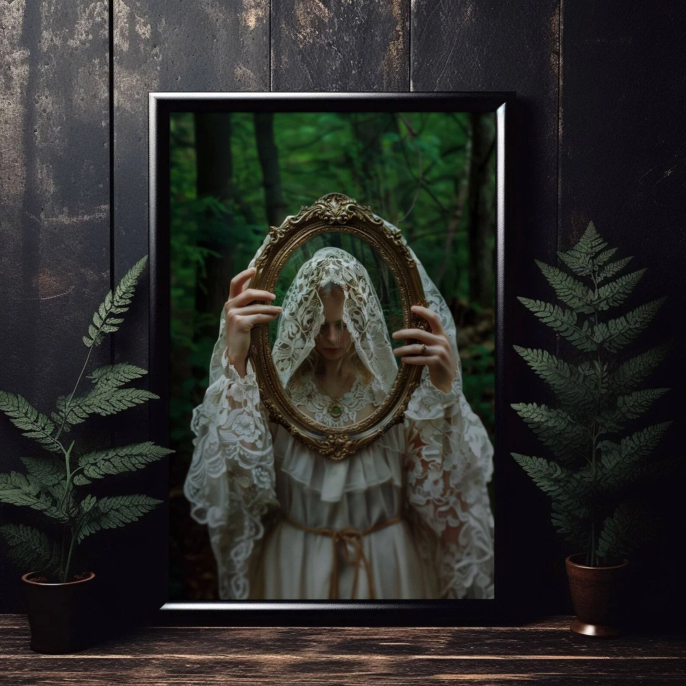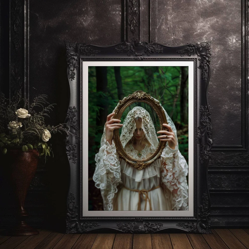 Gothic Woman With Mirror Art Print Dark Academia And Moody Victorian Decor Cottagecore Wall Art Material: Premium luster photo paper Print type: Inkjet printing One side printed + The finish provides the highest possible resolution and color saturation + Lasts up to 200 years in color and 400 years in black-and-white + Printed on high-quality resin-coated photo base paper medium + Posters can be hung with double-sided tape, tacks, or framed + Hand washing with a gentle cry cloth is recommended for extended durability I will hand select the best choice of paper for your chosen design to ensure top quality results for a beautiful, bright and luxurious print. All prints are sealed in cellophane slips for protection during transportation, and are shipped in a protective cardboard envelope.
