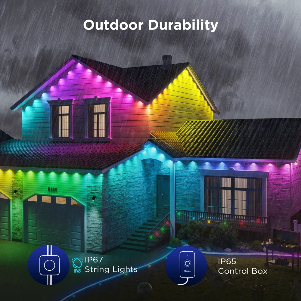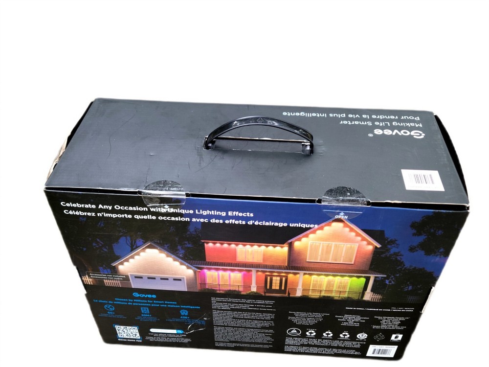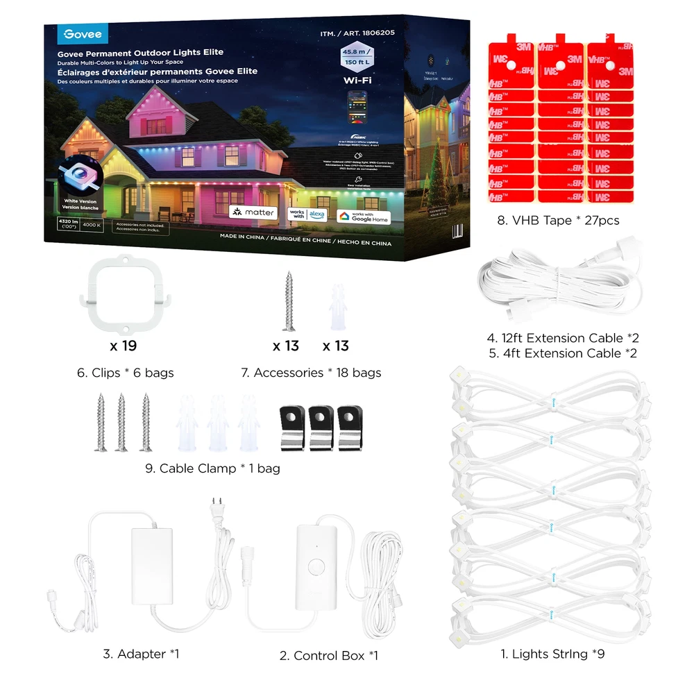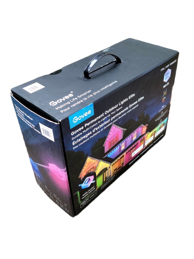 Govee 150ft Permanent Outdoor Lights Elite, Smart Festive RGBIC Lighting Features: Festive RGBIC Lighting Eye-Catching Lighting Effects Outdoor Durability Smart App & Voice Control Simple Installation Item # 1870005 Item Description Govee Permanent Outdoor Lights Elite Short Features Festive RGBIC Lighting; Eye-Catching Lighting Effects;Outdoor Durability; Smart App & Voice Control; Simple Installation Introduction Paragraph Adorn your home with a set of decorative permanent outdoor lights designed for any occasion. Install on the eaves, fences, or corridors to create visually appealing home decor. Features ✓Festive RGBIC Lighting Effects: Inspired by nature and holidays. ✓Outdoor Durability: The string lights are IP67 water resistant with an IP65 control box. Made from anti-UV material. ✓Eye-Catching Lighting Effects: Reveal a unique triangular lighting effect. ✓Simple Installation: Use the provided VHB glue and clips to install each light in 8 seconds. ✓Multiple Controls: Control via Govee Home App or voice assistants. ✓Matter-Enabled: Matter allows compatibility with major smart home ecosystems, providing more ways for users to customize and future proof their smart homes. Includes ★ 5.1m/16.7ft Lights String x9 ★ 3.6m/11.8ft Extension Cable x2 ★ 1.2m/3.9ft Extension Cable x2 ★ Clips x114 ★ Control Box x1 ★ Power Adapter x1 ★ VHB Tape x27 ★ Cable Clamp x3 Specifications Dimensions (L × W × H/D): 39.7cm × 15.3cm × 28.4cm ( 15.63 in. × 6.02 in. × 11.18 in.) Weight: 4.85 kg (10.7 lb.) Warranty 1 year limited