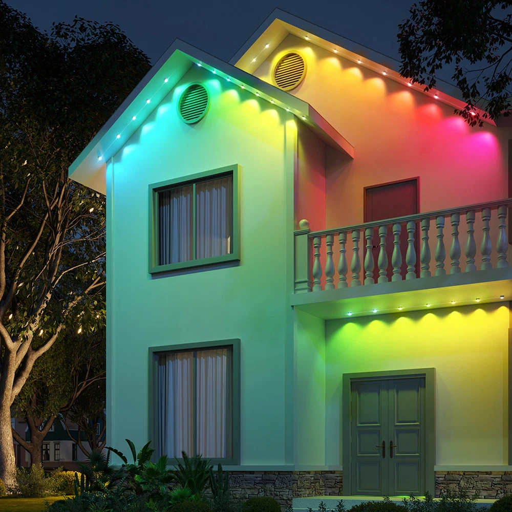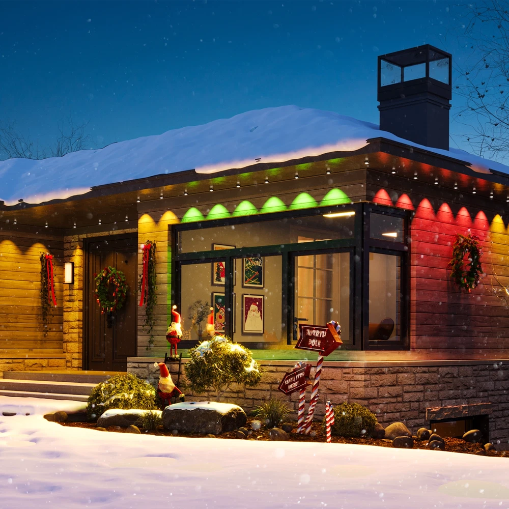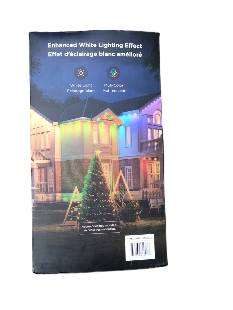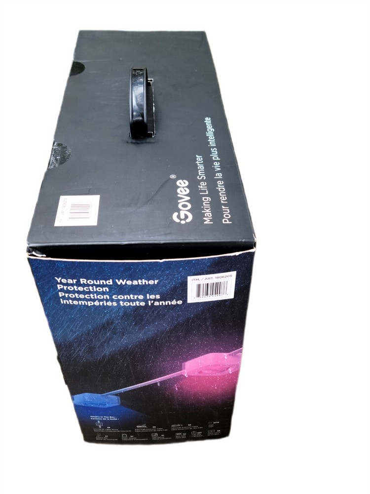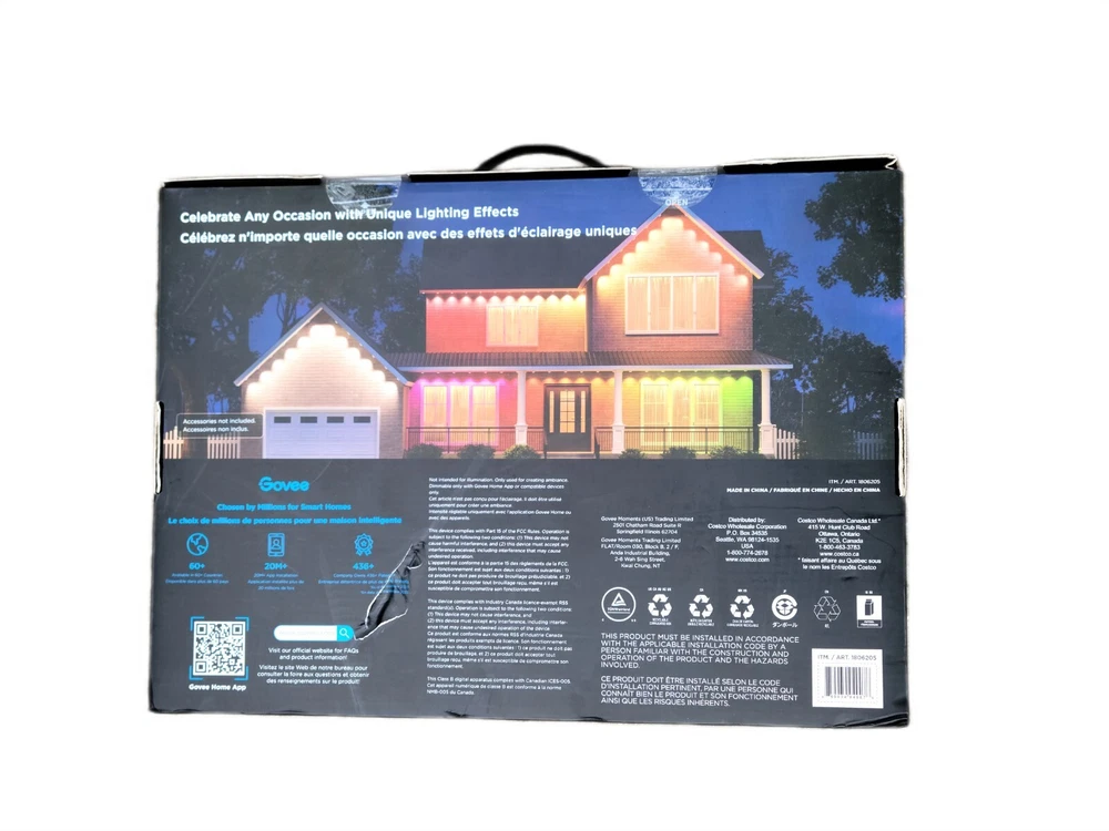 Govee 150ft Permanent Outdoor Lights Elite, Smart Festive RGBIC Lighting Features: Festive RGBIC Lighting Eye-Catching Lighting Effects Outdoor Durability Smart App & Voice Control Simple Installation Item # 1870005 Item Description Govee Permanent Outdoor Lights Elite Short Features Festive RGBIC Lighting; Eye-Catching Lighting Effects;Outdoor Durability; Smart App & Voice Control; Simple Installation Introduction Paragraph Adorn your home with a set of decorative permanent outdoor lights designed for any occasion. Install on the eaves, fences, or corridors to create visually appealing home decor. Features ✓Festive RGBIC Lighting Effects: Inspired by nature and holidays. ✓Outdoor Durability: The string lights are IP67 water resistant with an IP65 control box. Made from anti-UV material. ✓Eye-Catching Lighting Effects: Reveal a unique triangular lighting effect. ✓Simple Installation: Use the provided VHB glue and clips to install each light in 8 seconds. ✓Multiple Controls: Control via Govee Home App or voice assistants. ✓Matter-Enabled: Matter allows compatibility with major smart home ecosystems, providing more ways for users to customize and future proof their smart homes. Includes ★ 5.1m/16.7ft Lights String x9 ★ 3.6m/11.8ft Extension Cable x2 ★ 1.2m/3.9ft Extension Cable x2 ★ Clips x114 ★ Control Box x1 ★ Power Adapter x1 ★ VHB Tape x27 ★ Cable Clamp x3 Specifications Dimensions (L × W × H/D): 39.7cm × 15.3cm × 28.4cm ( 15.63 in. × 6.02 in. × 11.18 in.) Weight: 4.85 kg (10.7 lb.) Warranty 1 year limited