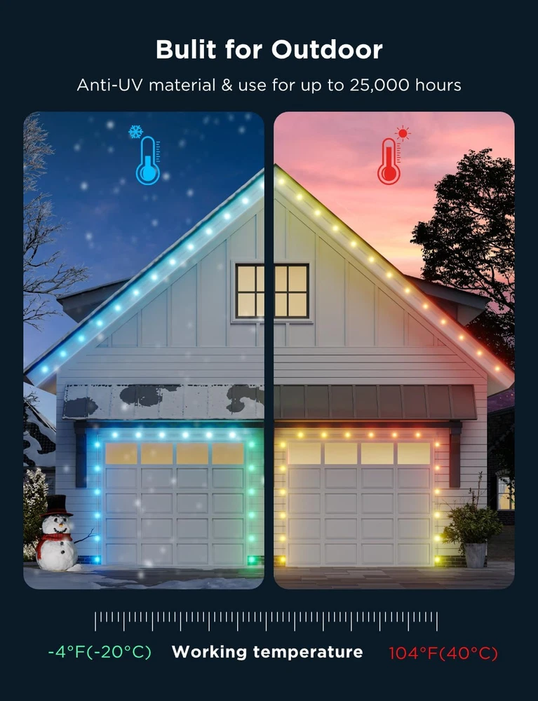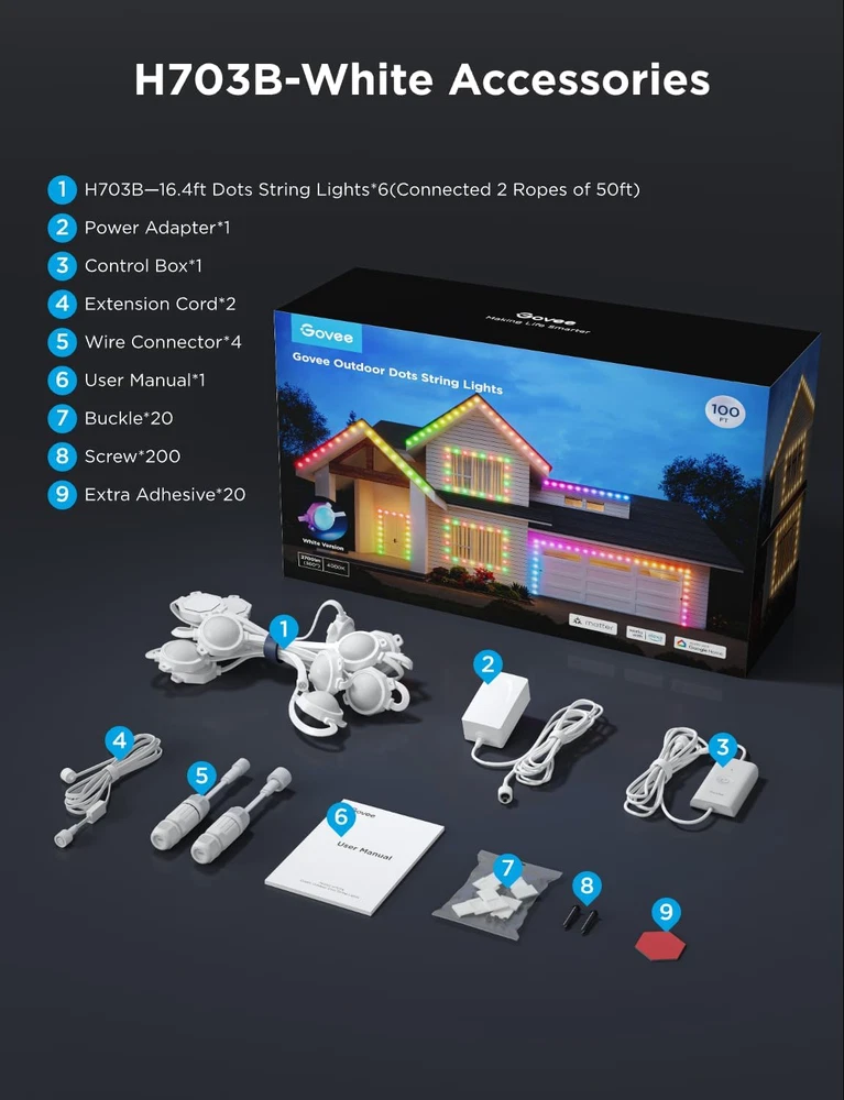 Store New Arrivals Add to Favorite View Feedback Contact Govee Outdoor Dots String Lights, Connected 2 Ropes of 50Ft(100Ft) Christmas Lights Outdoor, 90 Smart RGBIC LED Lights, 65 Scene Modes, IP65 Waterproof for Christmas Decor, Works with Alexa, Matter Description Item model number H703B Light Source Type LED Number of Light Sources 90 Color Temperature 4000 Kelvin Brand Name Govee Brightness 30 Lumen Color White Country of Origin China Brand Govee Material Plastic Material Type Plastic Model Number H703B Voltage 110 Volts (AC) Style Name Modern Manufacturer Govee Package Dimensions 16.25 x 11 x 5.5 inches; 10.65 Pounds Power Source Corded Electric Size 100ft Festive RGBIC Lighting: Brighten your holidays with Govee Outdoor Dots String Lights. These Christmas lights outdoor offer 16 million colors and visualized lighting effects, transforming your garage, window, and eaves into a vibrant holiday decor. Bright and Adjustable Glow: Each LED Christmas lights emits a 4000K white light at 30lm, with adjustable warm cold color temperature and brightness settings. These outdoor Christmas lights are suitable for festive gatherings and house decor. Outdoor Durability: Even in -4℉ to 104℉ cold environments, these IP65 waterproof outdoor lights can function normally. Ideal for winter, lasting up to 25,000 hours, keeping your house and garage beautiful. Control box is IP65, adapter is IP44. Diverse Lighting Modes: Choose from 65 scene modes and 6 music modes to suit any festive occasion. With DIY and AI options through the Govee Home App, your govee outdoor lights can transfer effortlessly from Halloween lights to Christmas decorations. Smart App Control: Manage your Led lights easily with WiFi/Bluetooth and Govee Home App. Compatible with Alexa, Matter and Google Home. Adjust your lighting with a tap or voice command, adding a touch of magic to your Christmas decorations. Simple Installation: Install with ease using adhesive backing or screws. You can cut and reconnect the outdoor string lights to design your own unique layout. Notes: It is recommended to use screws when installing on a wooden surface. Charming Christmas Decor: These outdoor Christmas lights will brighten up your holiday decorations, making them perfect for the festive season and an ideal Christmas gift. Product Description 1 Christmas Celebration 2 Halloween Decoration 3 Valentine's Day 4 Party Decoration 1 Christmas Lighting 2 Halloween Lighting 3 Warm White Lighting 4 Cold White Lighting 1 Garage 2 Window 3 Eaves ABOUT US We offer the best prices around on high quality products. Our E-store includes media such as books, movies, music and games while offering electronics, toys, sporting apparel, clothing, tools, general home, garden items and more. SHIPPING We are always working hard to ensure your package arrives as soon as possible. Please understand that some factors like weather, high postal traffic, and the performance of shipping companies are outside of our control. For shipping outside of the continental USA, we only use eBay's Global Shipping Program.The item is shipped to KY and then sent to the rest of the world. International customers are responsible for all duties and taxes. Continue to check out in order to calculate costs for shipping the item to your country. Messages regarding eBay's Global Shipping Program MUST be directed at eBay EXCLUSIVELY. RETURNS We offer a 30-Day Return Policy on items which you are not completely satisfied with. You have the option for a full-refund or an exchange of the item. No returns are available on items shipped outside of the USA. PAYMENT We accept PayPal. CONTACT US This page content is yet to come Please ad us to your favorite seller and visit again later Thank You CUSTOMER SATISFACTION We try our very best to make sure every customer is completely satisfied. If there's a problem, message us! We're happy to help. WE ACCEPT Copyright © 2021 AutoDS. | All Rights Reserved
